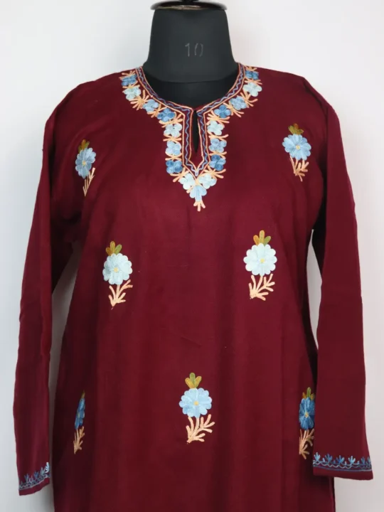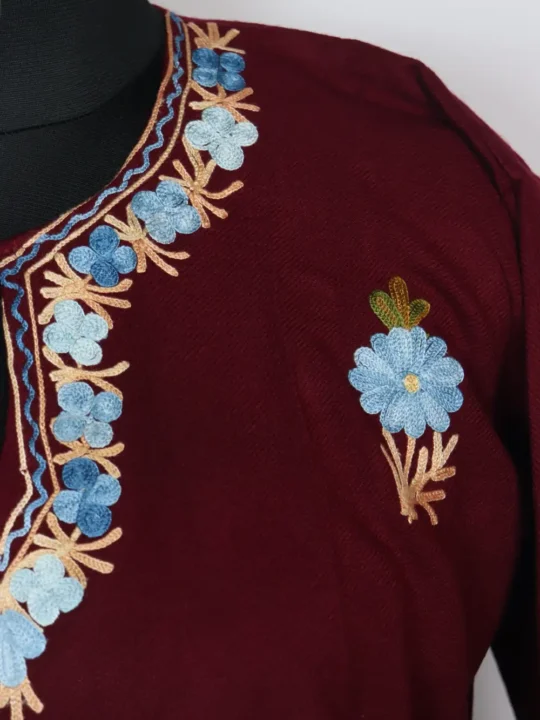 This woolen kashmiri kurti set comes with neat floral Aari work around the neckline with bootis spread all across the front and with the matching lower, making the whole set look well-finished.