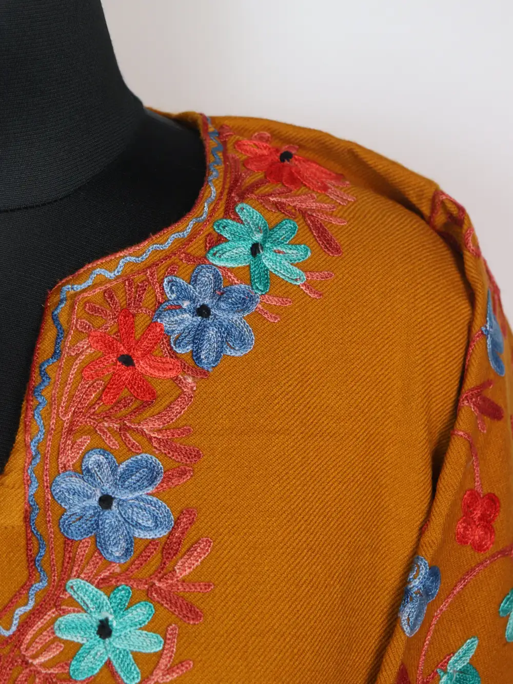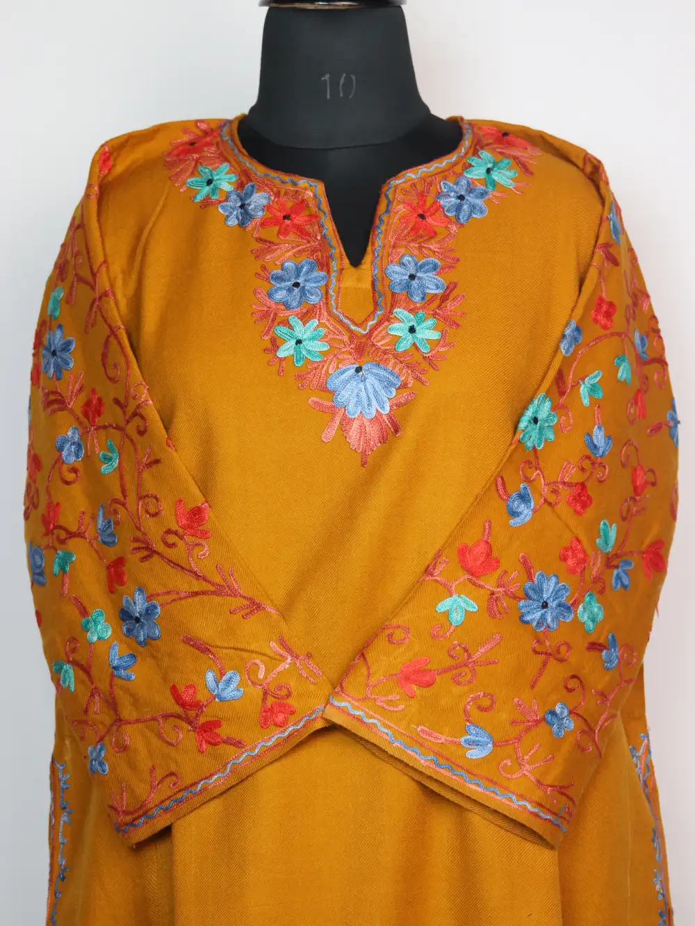 Made from comfortable cashmilon wool, this pheran has a beautifully embroidered floral aari neckline and full sleeve jaal work that gives it a rich and graceful style.