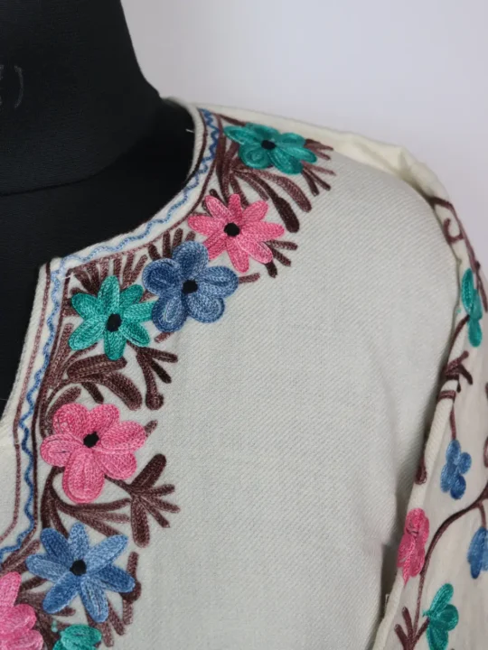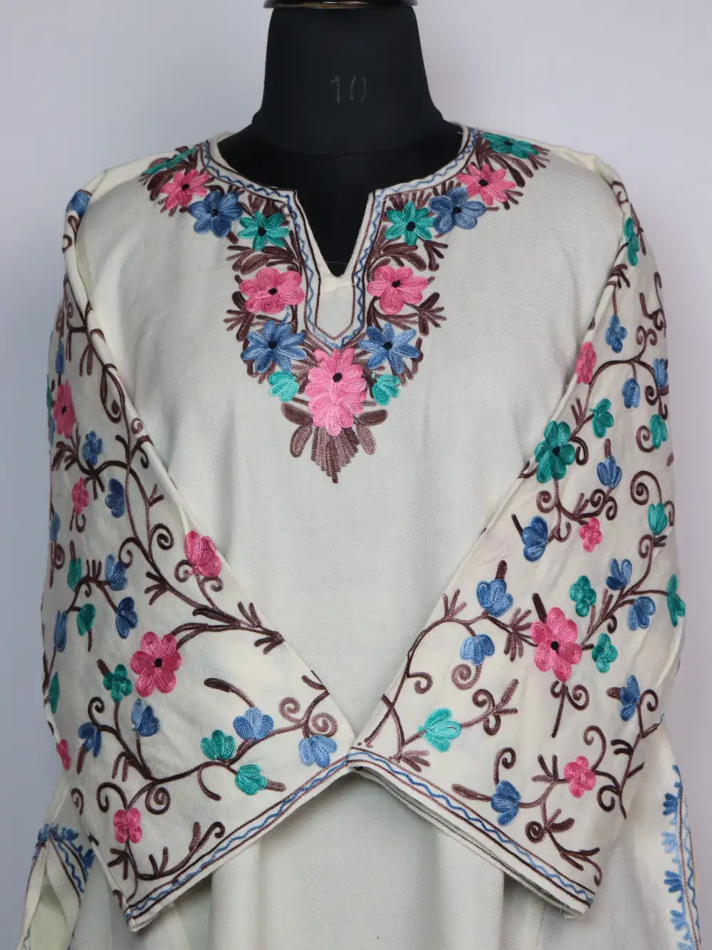 This cashmilon white wool feran feels warm and soft, with neat posh bagh aari kadhai around the neckline and detailed jaal work on the sleeves that adds a classic traditional look.