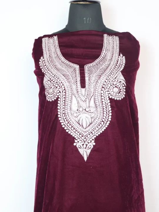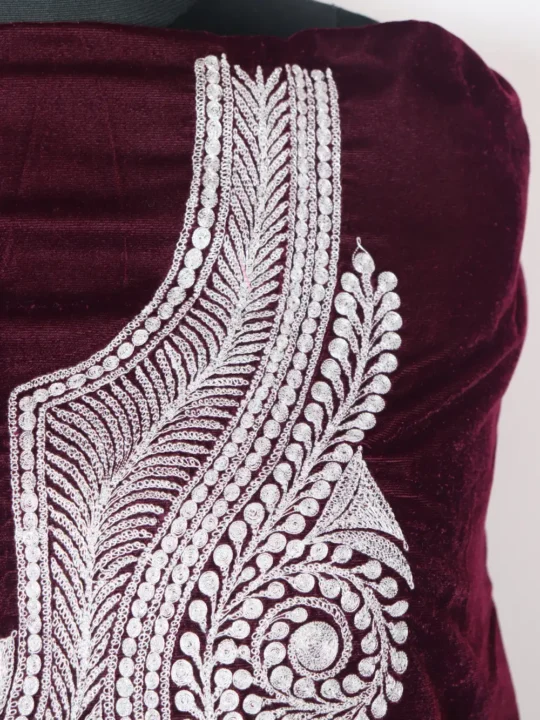 Velvet soft fabric gives this 2pc suit its warm feel, while beautiful silver botte tilla work decorates the neckline. The outfit comes unstitched, including kameez and salwar, allowing you to personalize the stitching to match your own measurements. DUPATTA IS NOT INCLUDED.