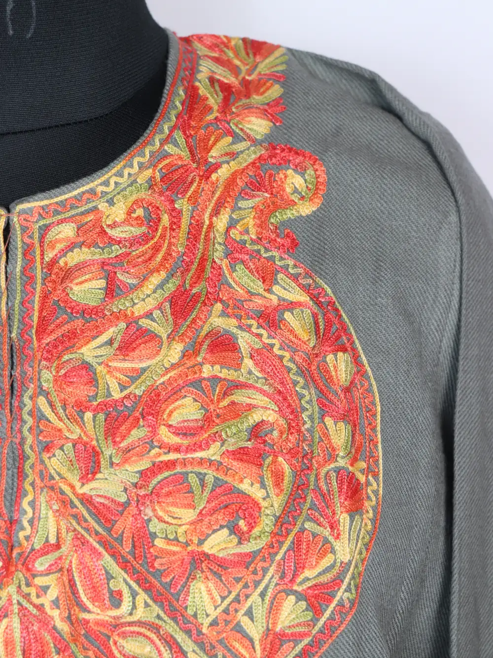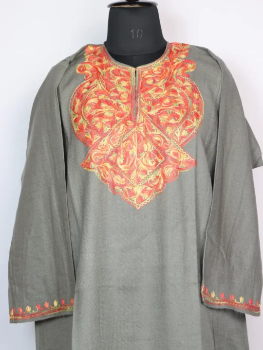 This Cashmilon pheran blends tradition with comfort, with Aari floral kadhai motifs around the neckline.