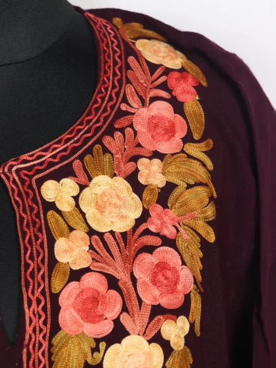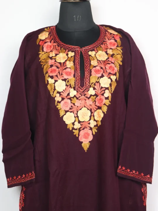 This wine colour pheran is tailored from Cashmilon wool for soft structure and easy layering. Aari embroidery at the neckline has stitched florals to create a decorative frame that enhances the front. Chest size 49 inches and length 42 inches to provide generous comfort.