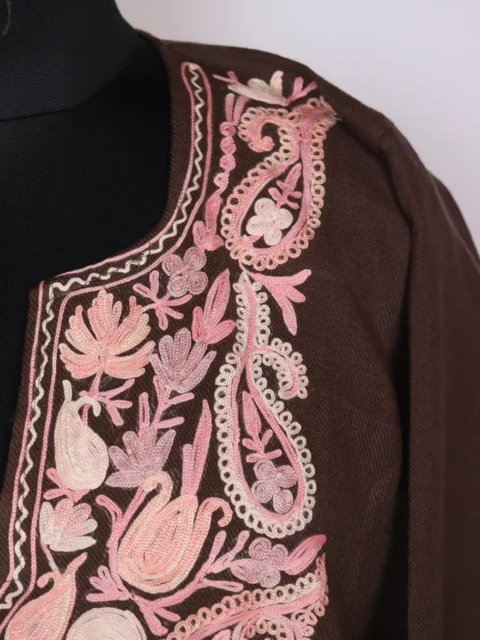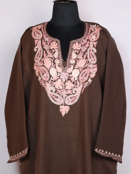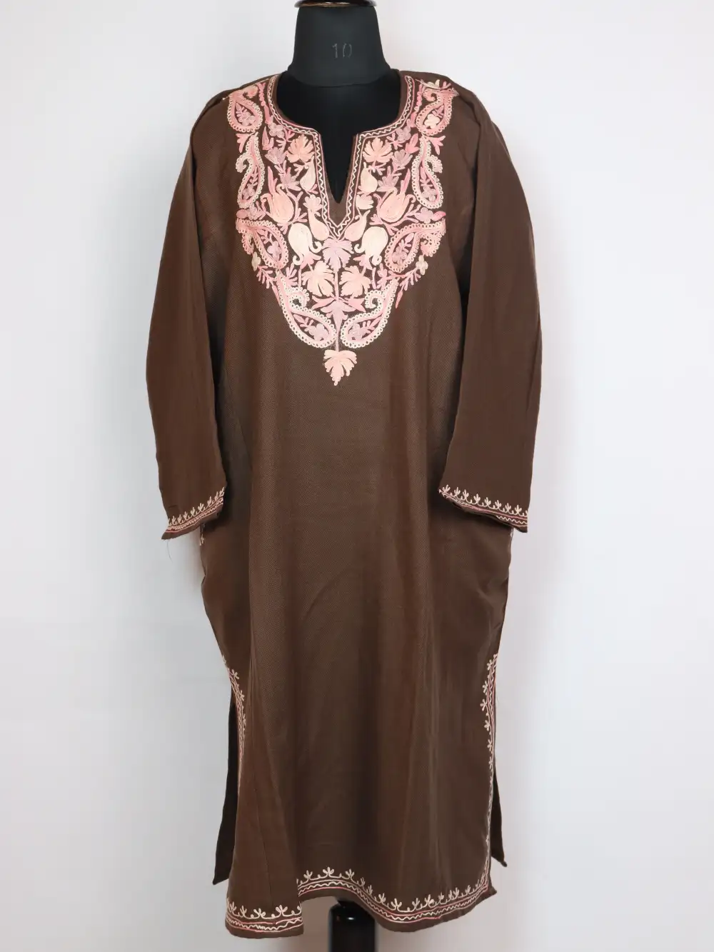 Cashmilon Wool Kashmiri feran in beige colour shows Aari kadhai at the neckline in badam and floral motifs. It comes in chest size 52 inches and length 45 inches that allows generous movement.