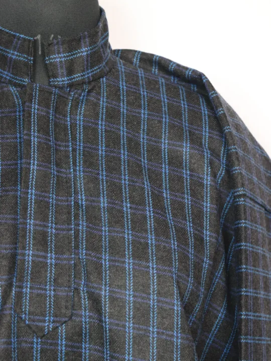 Woven in Tweed wool, this black Kashmiri check phiran gives steady warmth and a calm fit. Its chest size 48 inches and length 31 inches ensure roomy comfort. It is easy to layer and it carries a measured Kashmiri presence for daily winter wear.