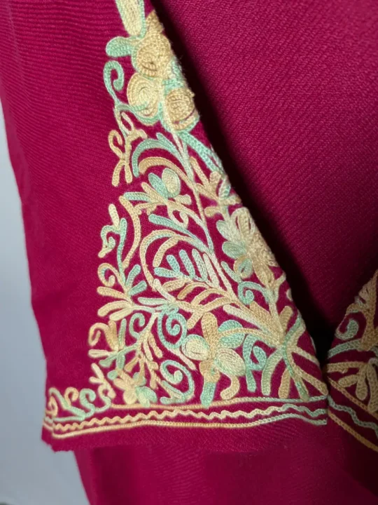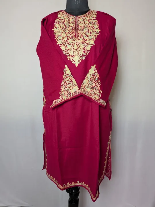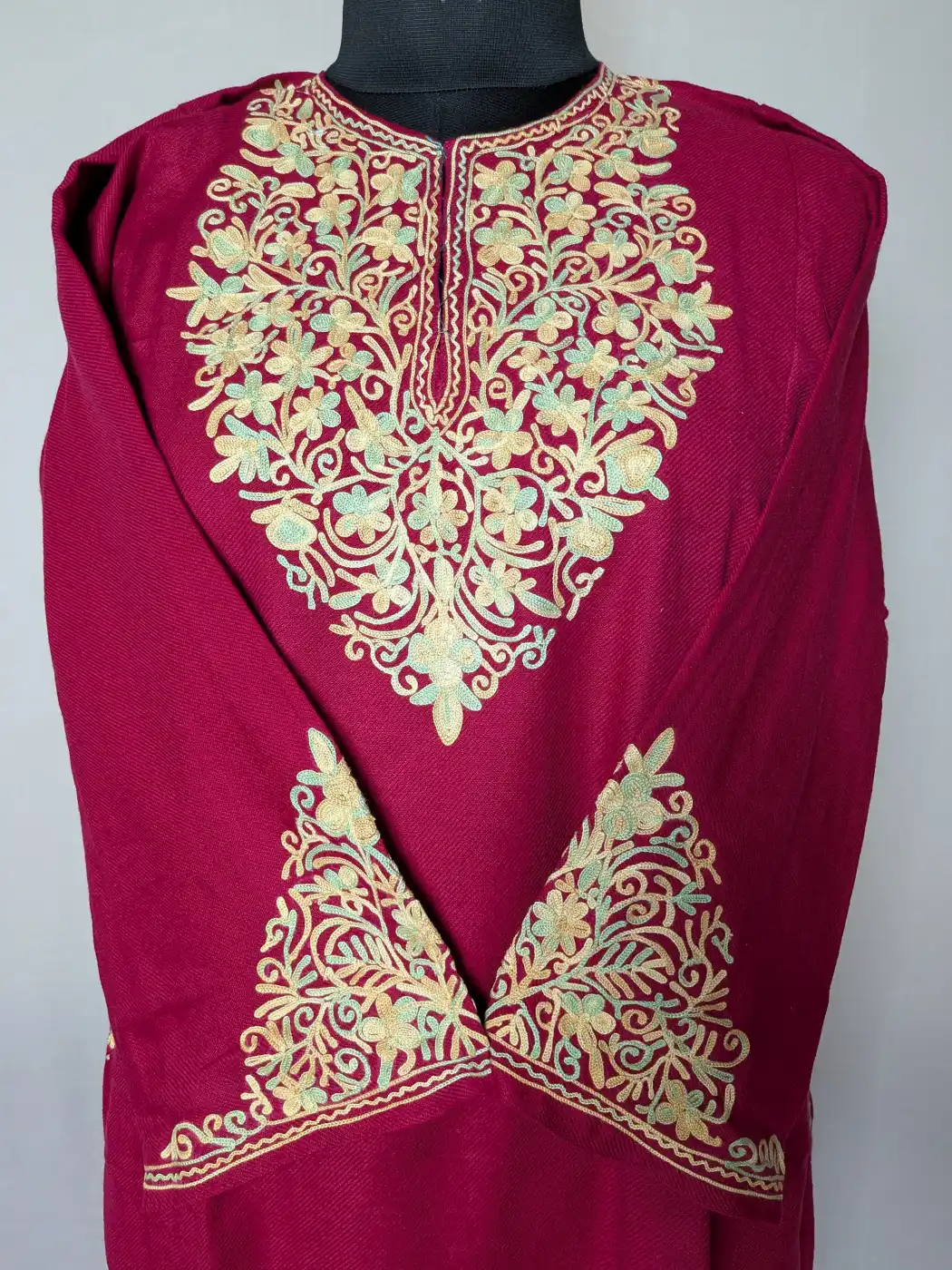 A magenta color pheran that merges tradition with seasonal comfort, made in warm Cashmilon and adorned with floral Aari embroidery around the neck and sleeves, which is done in yellow and light blue. Its softness ensures coziness while its elegant embroidery brings style to your winter outfits. Whether worn with jeans or traditional wear, it remains a graceful, go-to piece for the season.