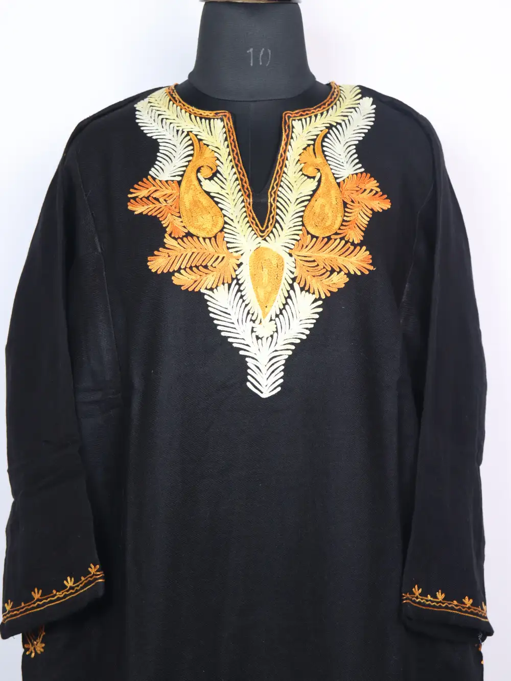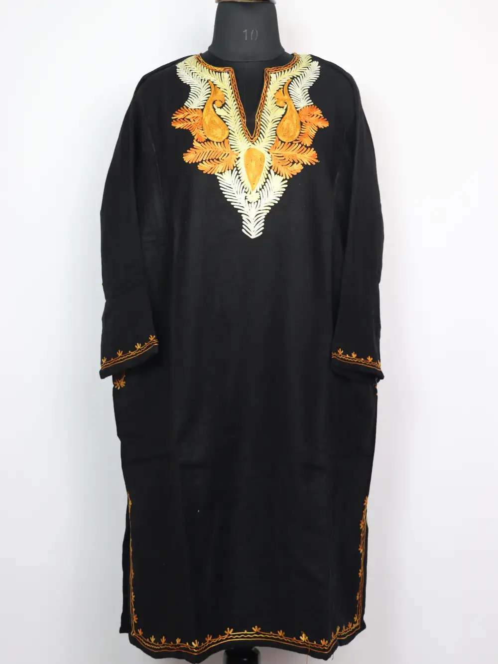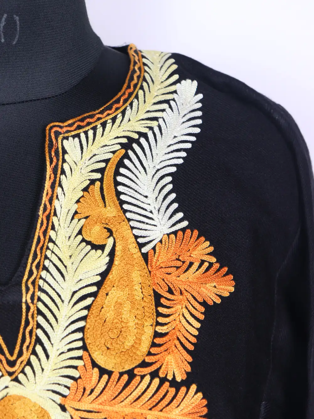 Kashmiri black phiran features Aari embroidery at the neckline styled with lavender floral beds. It has chest size 52 inches and length 42 give comfortable proportions.