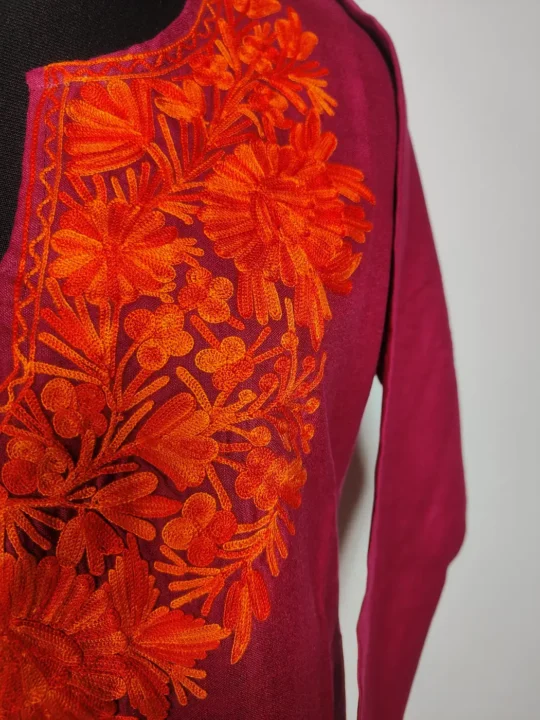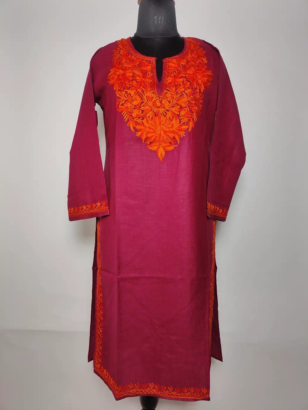 Designed in ruby cotton for warm climates, this maroon colour best kurta highlights Kashmiri aari embroidery at neckline in floral motifs. Its fabric is what makes it soft and wearable daily.
