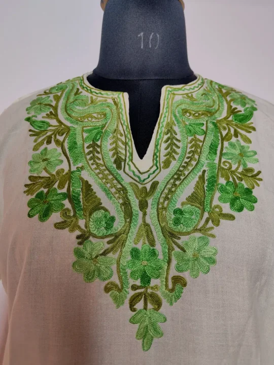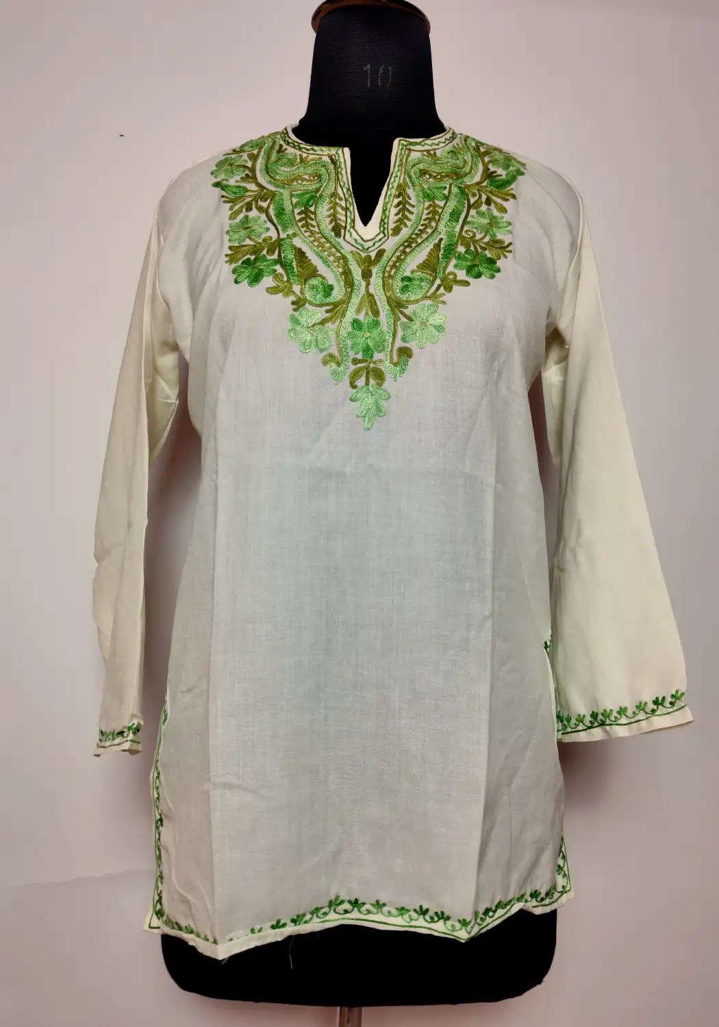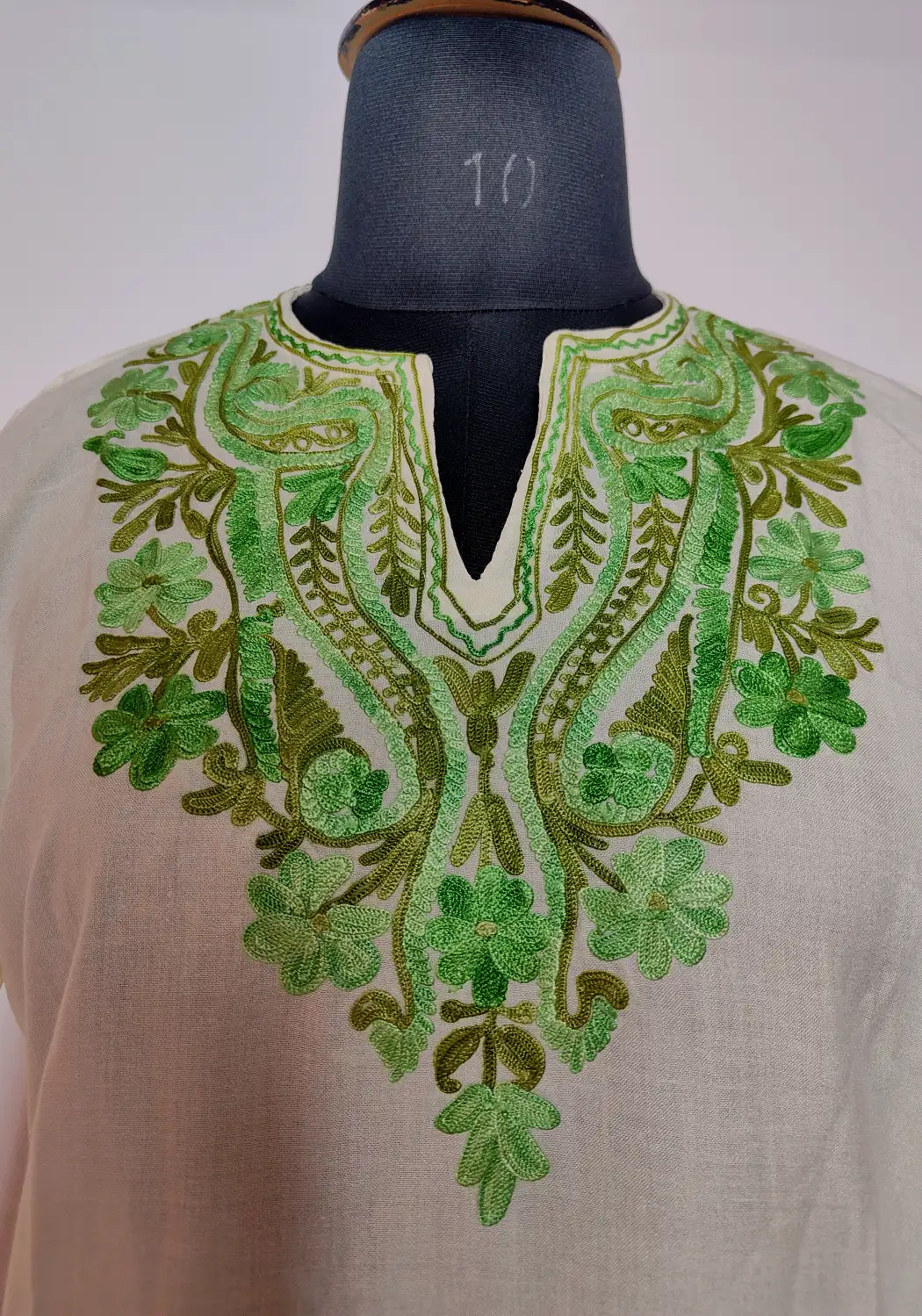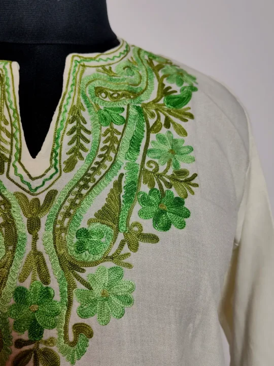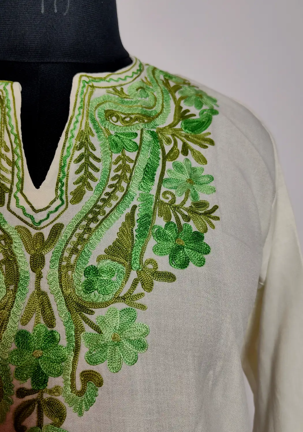 This aari work kurta stands out for its clean white cotton base and light feel. Crafted in summer cool fabric, it features badam embroidery at the neckline, which creates a subtle focal point while keeping the overall design minimal and easy to wear.