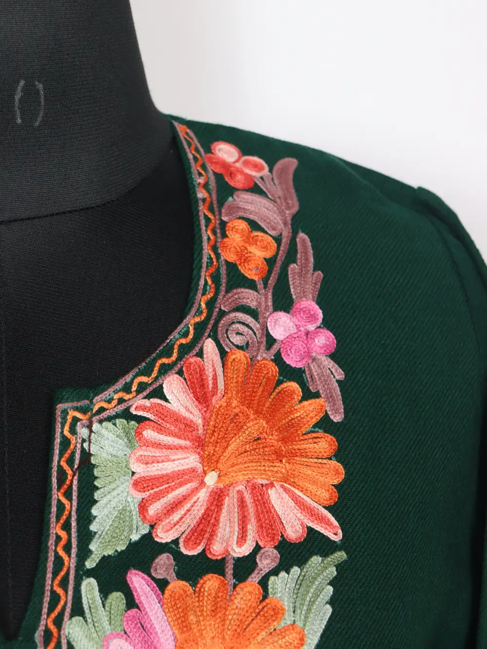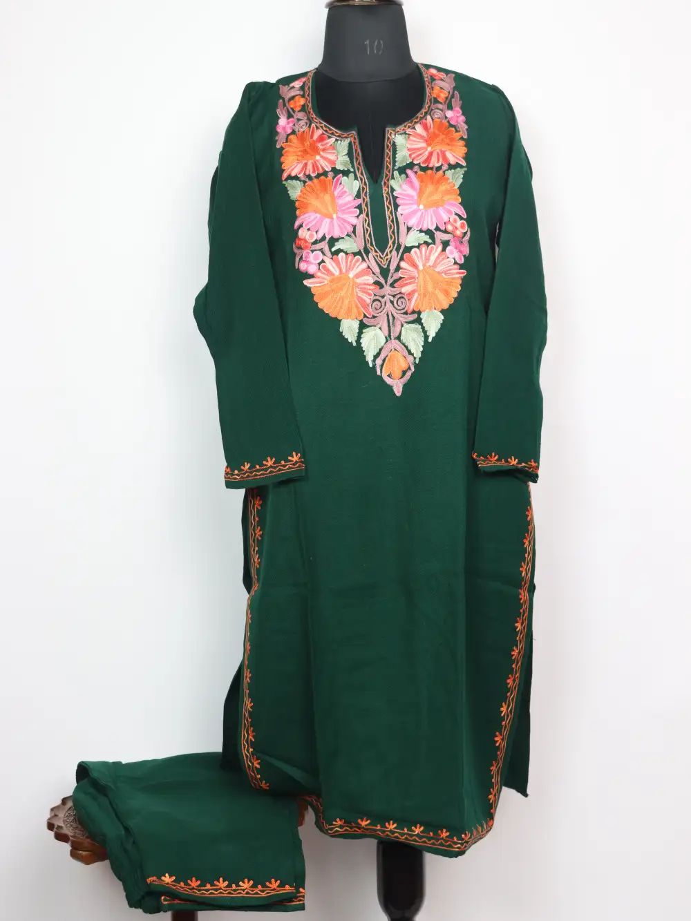 Styled as kurti with trouser, this kadhai kurta set uses Cashmilon wool and shows Aari embroidery into alternating blossom and leaf motifs along the neckline which creating visual rhythm. It includes pockets on both sides which add function without bulk.