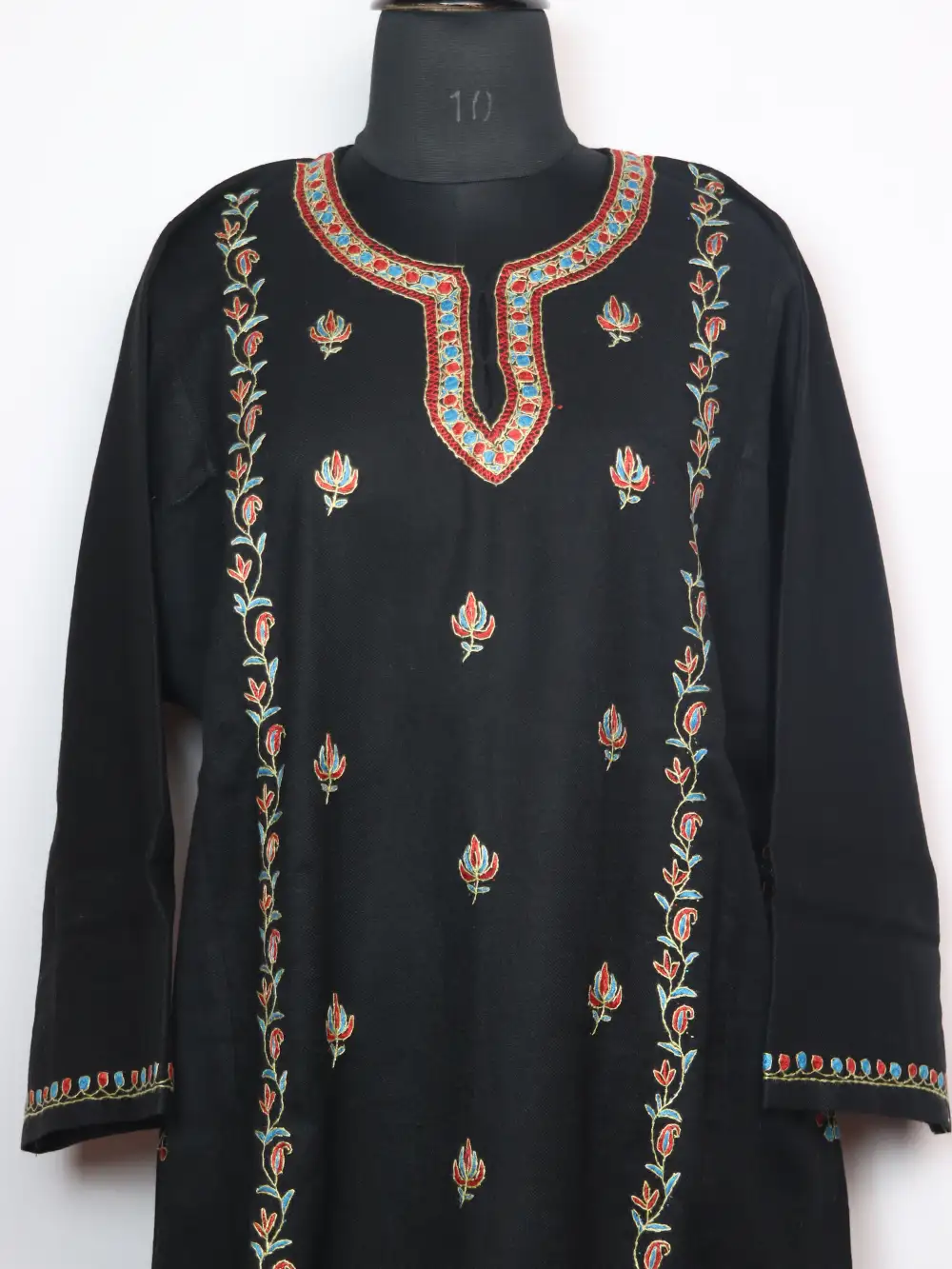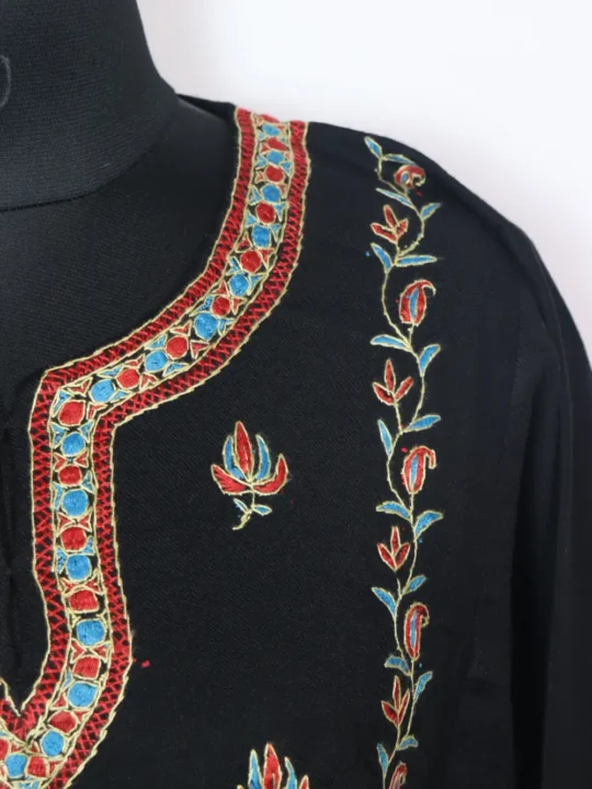 Crafted in raffal wool, this black colour stylish kashmiri pheran brings winter warmth with calm elegance. Hand sozni embroidery is arranged around the front panel in booti style. C