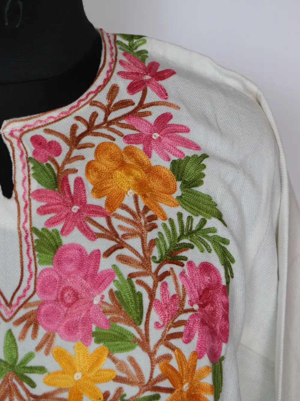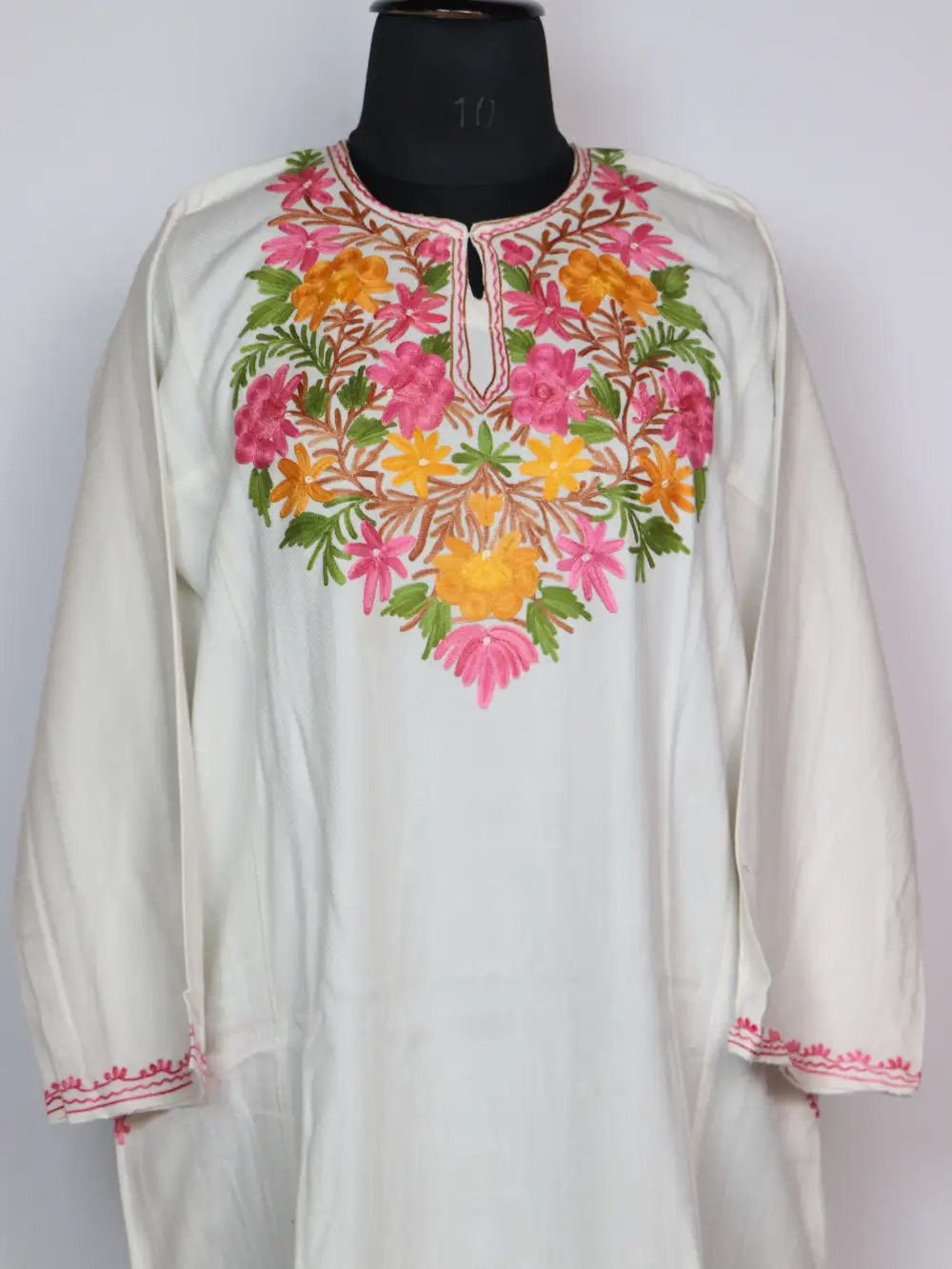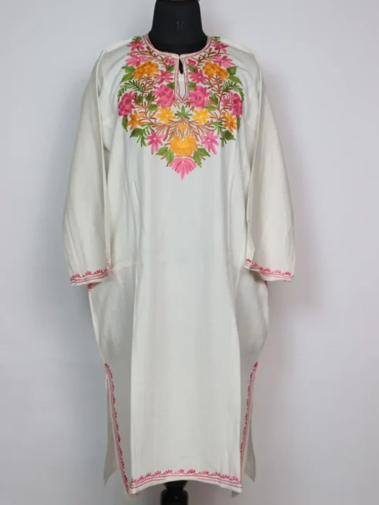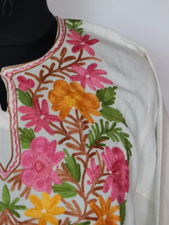 This white Cashmilon pheran stands out with its colorful floral aari work, where the embroidery highlights the neckline. it brings vibrance to winter fashion, with soft wool ensuring comfort throughout the day and two functional pockets on the sides.