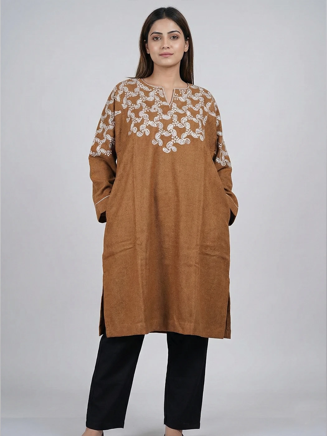 Note: The actual color of the pheran may differ slightly due to photography effects