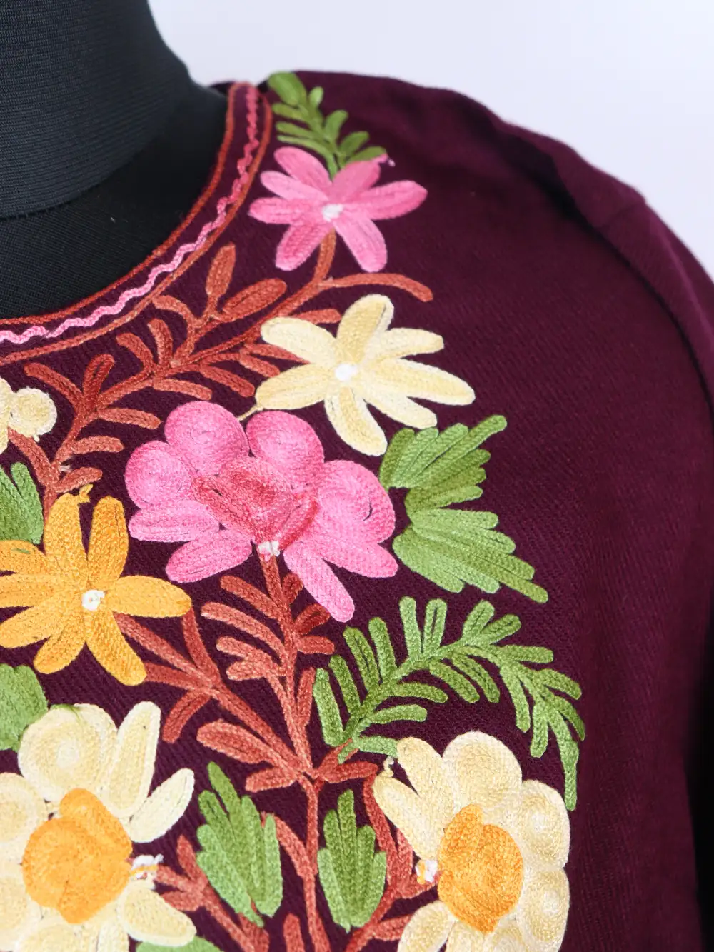 This wine hue pheran in cashmilon wool is styled with care to make winters comfortable and beautiful. Its neckline is embroidered in Aari style to create those pink -yellow florals and green leaves on brown vines, providing elegant detail. Women will appreciate its softness and warmth, because it is paired with a design that remains both elegant and attractive. This outfit that is versatile and practical, it becomes a go-to choice for seasonal wear with elegance.
