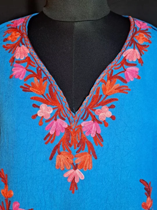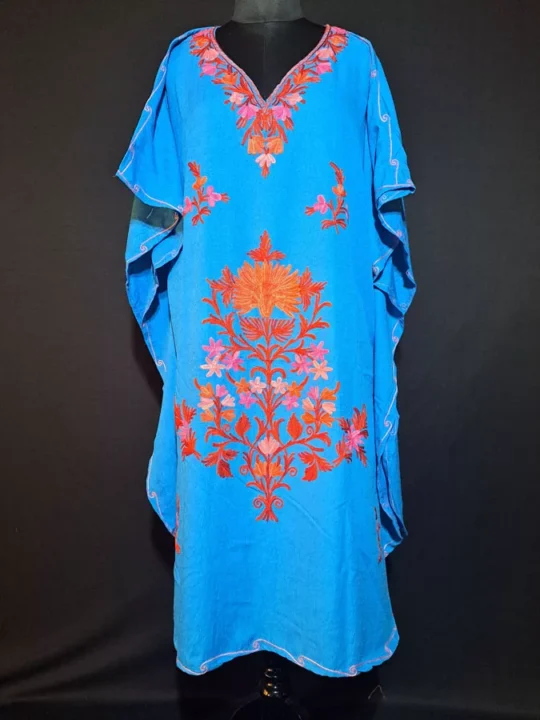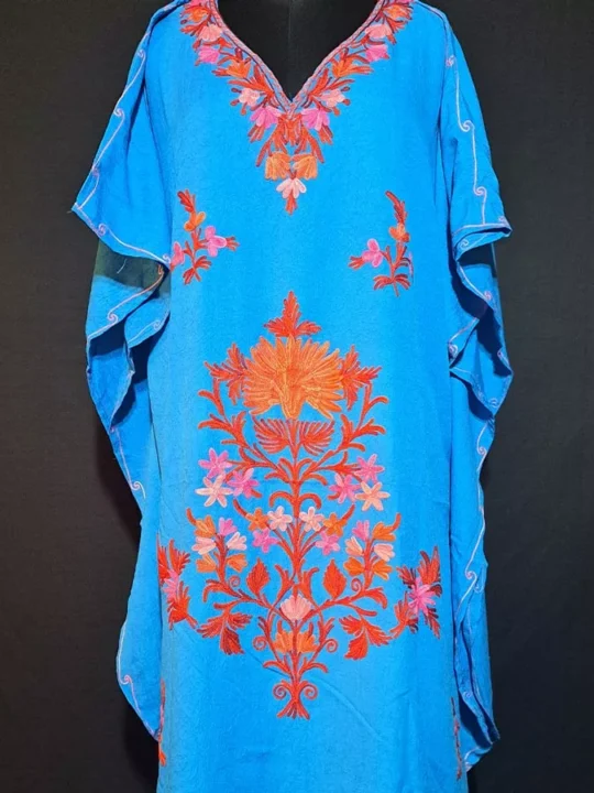 Style your look with this ferozi crush cotton Kaftan and embrace the timeless elegance of Kashmiri embroidery. Add it to your collection today and experience the unmatched beauty and charm of artisanal craftsmanship.