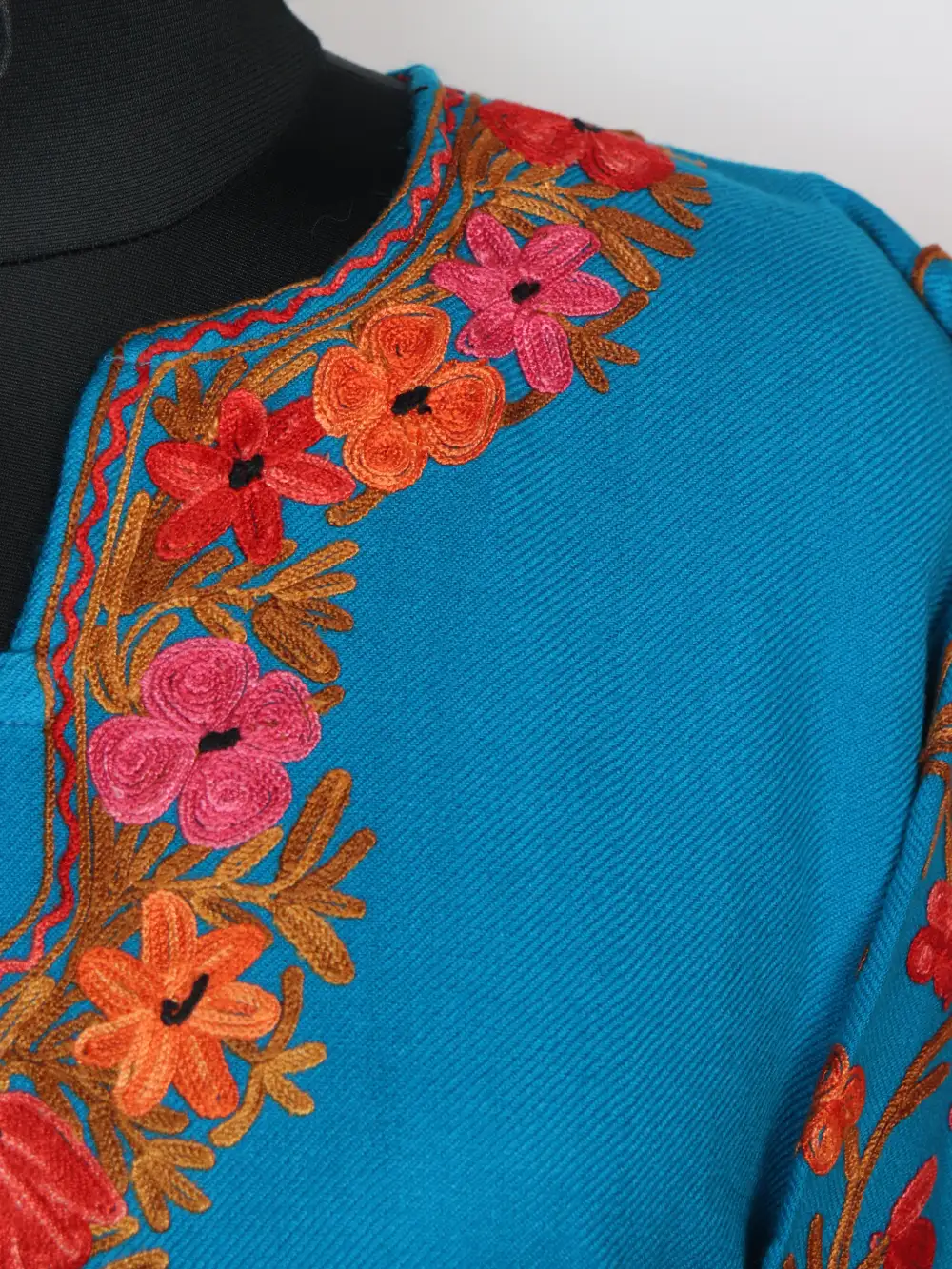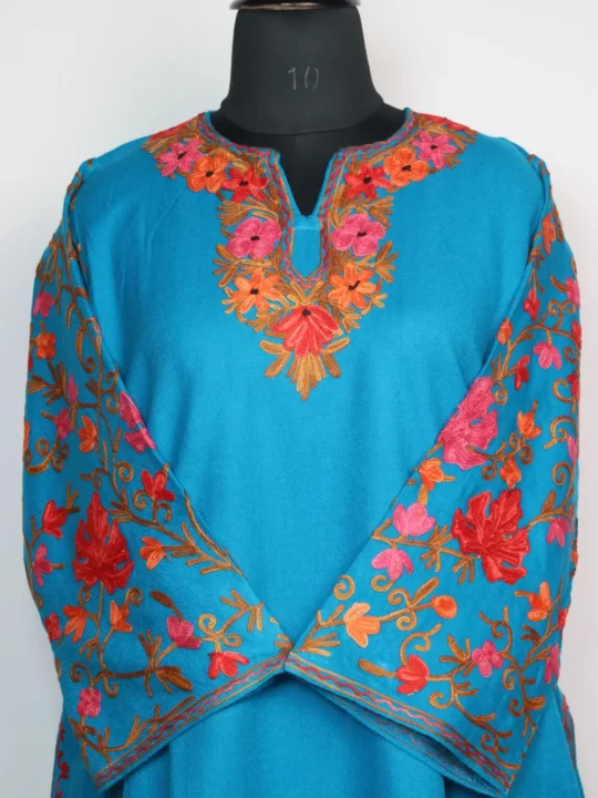 This pheran offers a soft feel with cashmilon wool and features a neat posh bagh aari neckline along with jaal work on the sleeves which gives an elegant style.