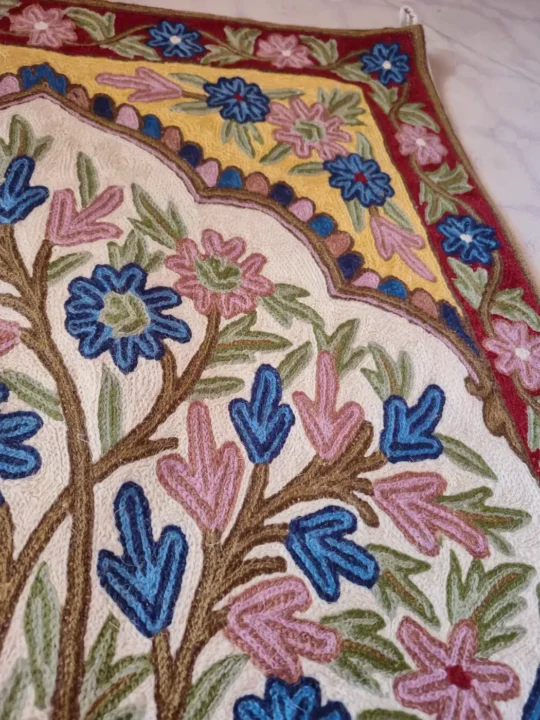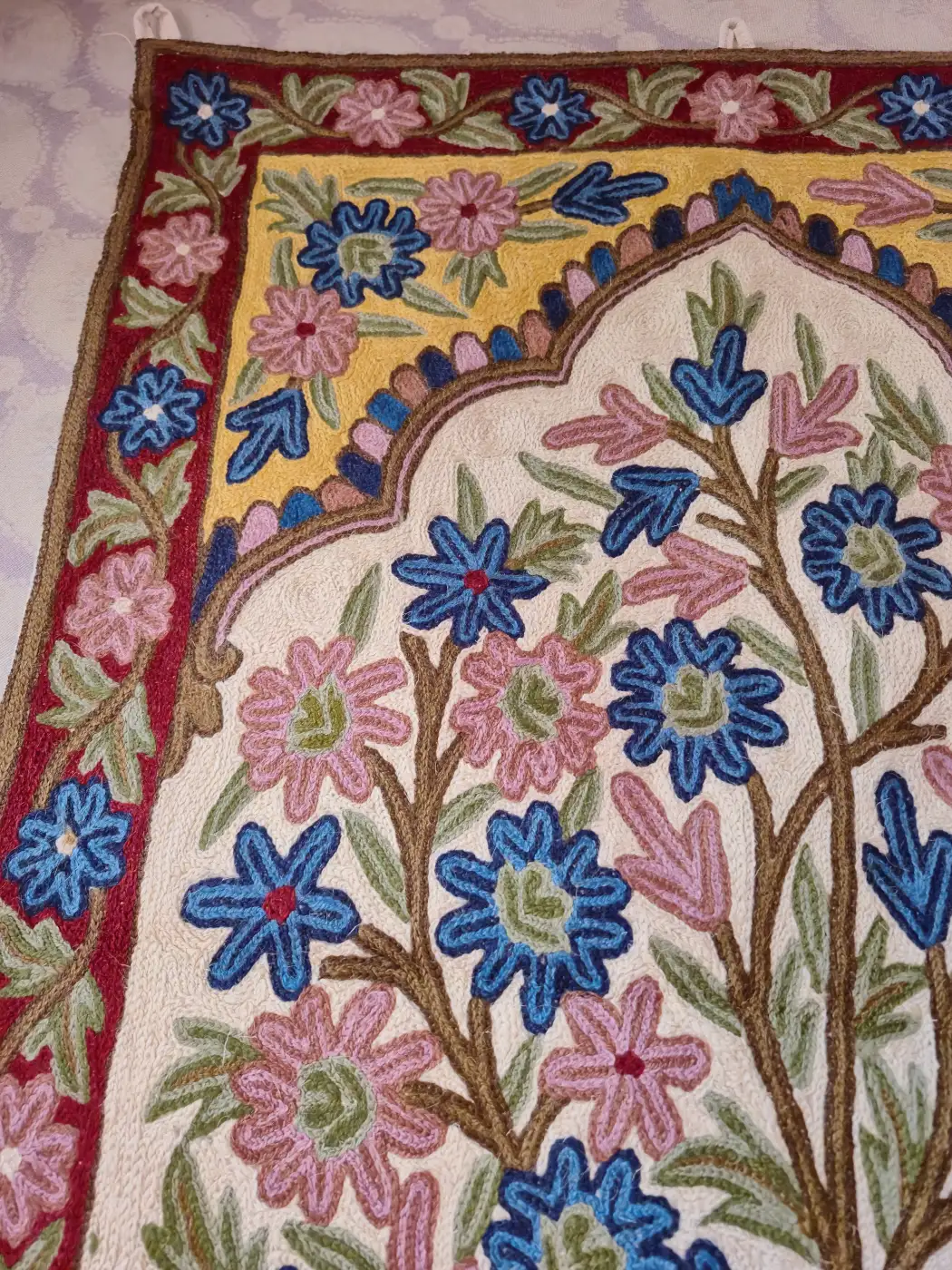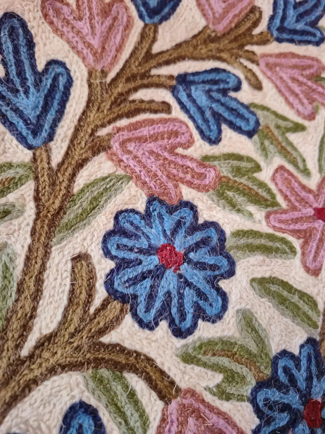 Designed in dusoot cotton for home styling, This Kashmiri wall decor carries Kashmiri hand chain stitch embroidery which is stitched in wool threads. This wall hanging features a plant filled with beautiful blossoms, It offers a blend of simplicity and charm, which makes it perfect for modern or traditional homes, and perfect for enhancing walls with subtle floral beauty. It decorates spaces beautifully, highlights heritage needlework, and introduces cozy artistic spirit, texture, and handcrafted elegance into rooms, to make walls expressive, cultural, and visually rich for homes that seek traditional decorative accents and warmth.