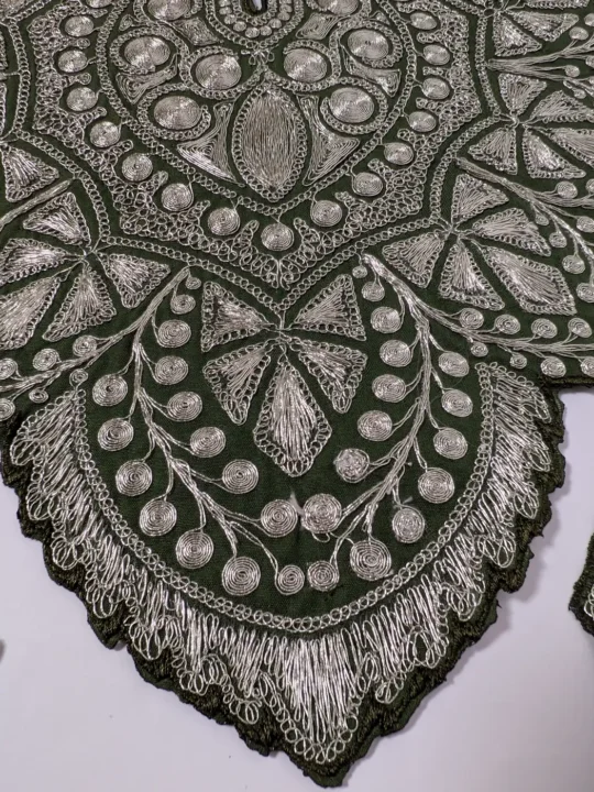A forest green base carries this patch set where leafy embroidery enhances the neck patch and sleeve patches. The lace features continuous silver tilla work, bringing unity to the design and giving the set a complete traditional presence.