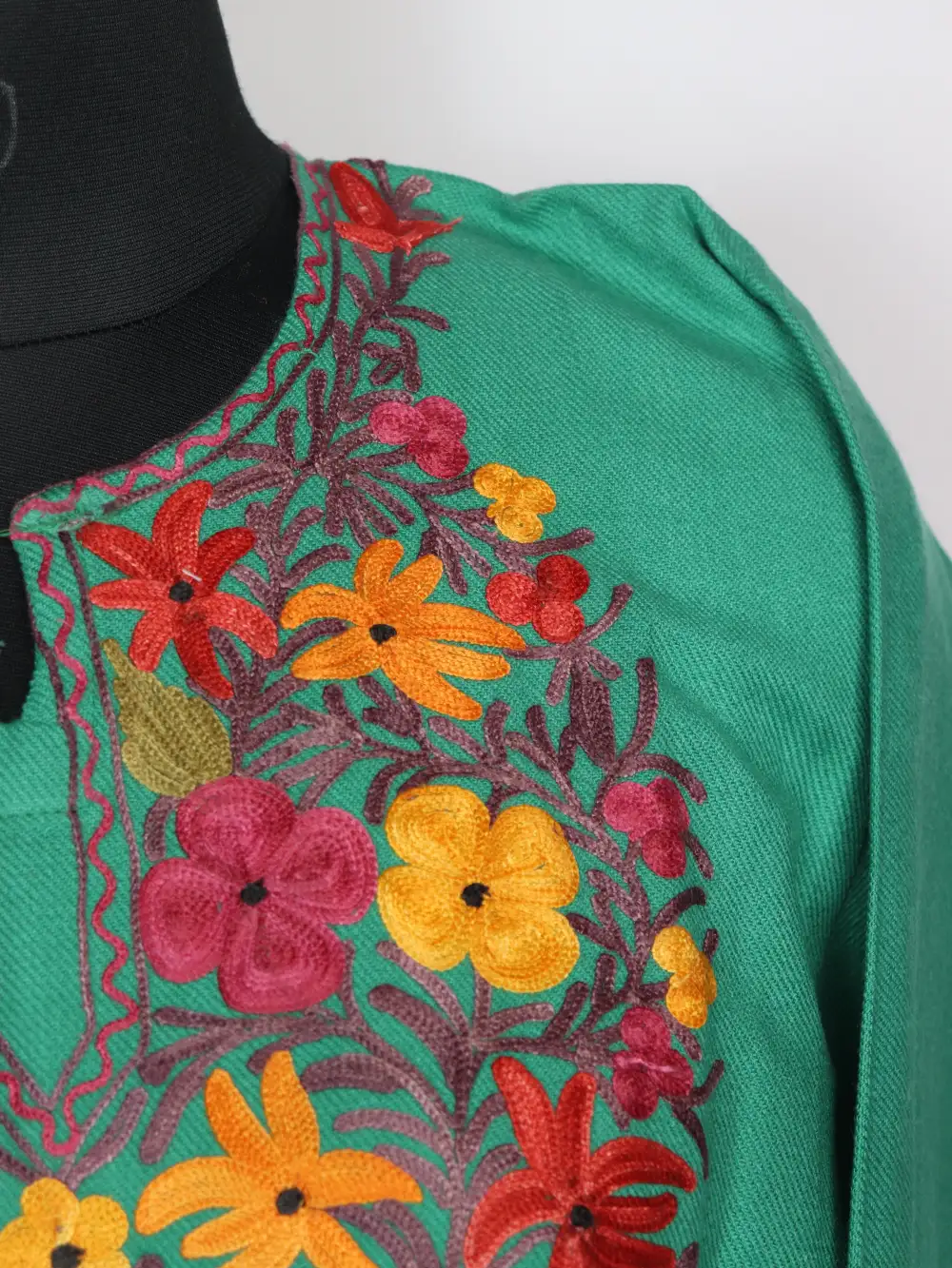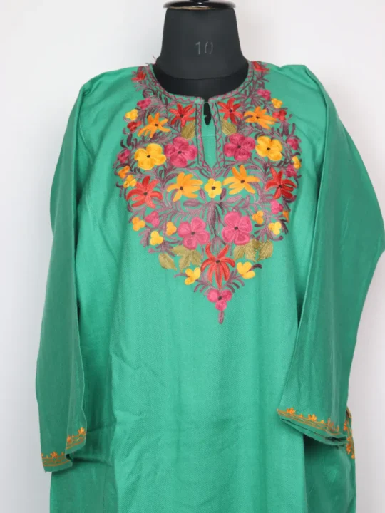 A soft cashmilon wool pheran with floral embroidery aari detailing around neckline. Comes with pockets on both sides for regular use. It brings a clean everyday look.