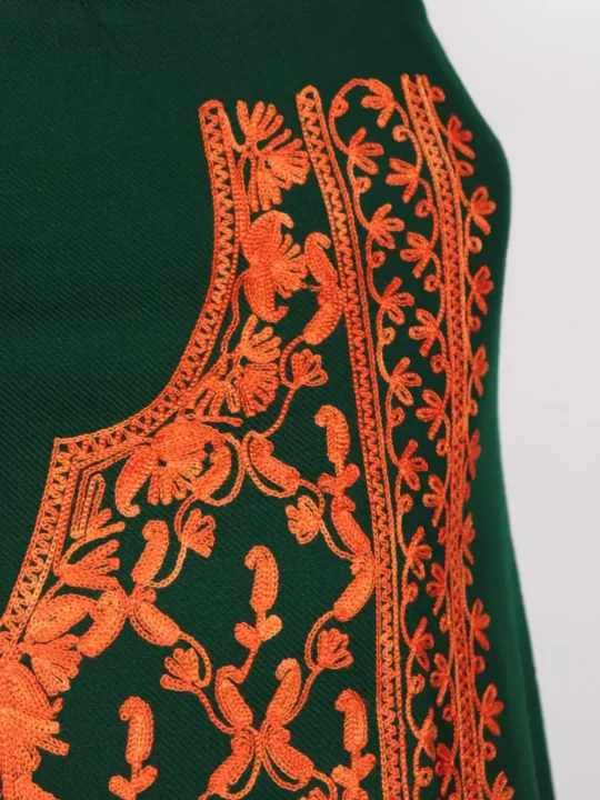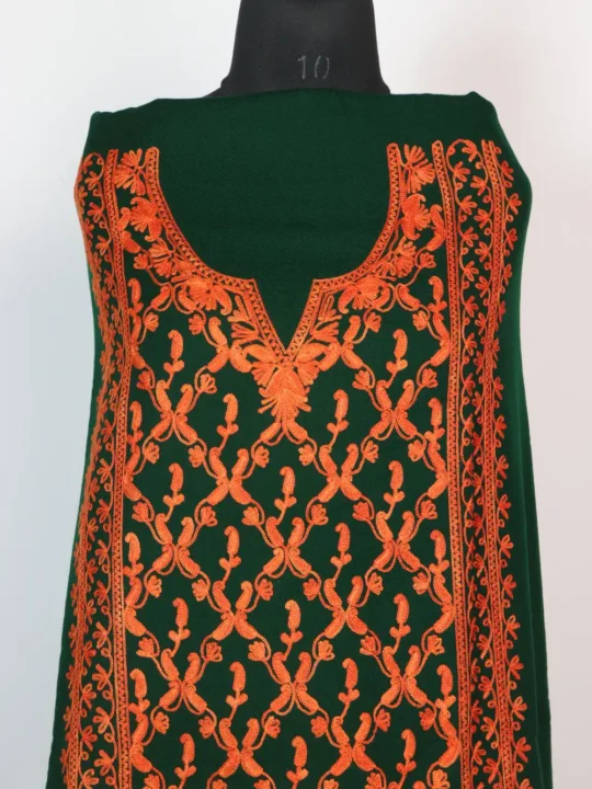 A woolen dark green unstitched 2pc Suit made from cashmilon wool, the front panel features full badam geometrical work in red threads. The Aari embroidery is detailed yet understated, which gives this 2pc Suit a refined elegance suitable for winter layering. Ideal for those who are exploring garam suit options, this 2pc Suit balances comfort, style, and artistry.
