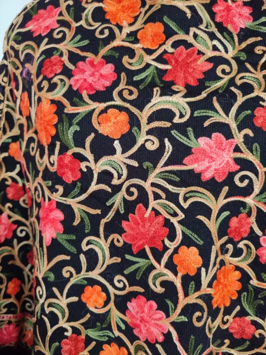 Crafted in soft (narm) Cashmilon wool, this Fur Poncho adds a layer of warmth and style to your winter days. This Aari work, features pink and mustard floral designs all over, brings a touch of elegance to the deep black base. It is sized 43 inches side to side and 37 inches long, it drapes comfortably and comes with no lining. It is a cozy pick for those seeking women poncho without hood styles.