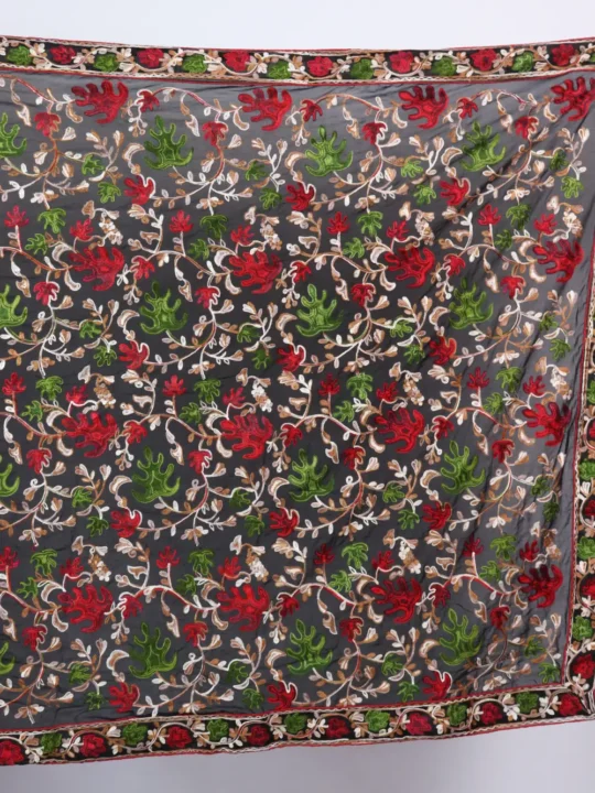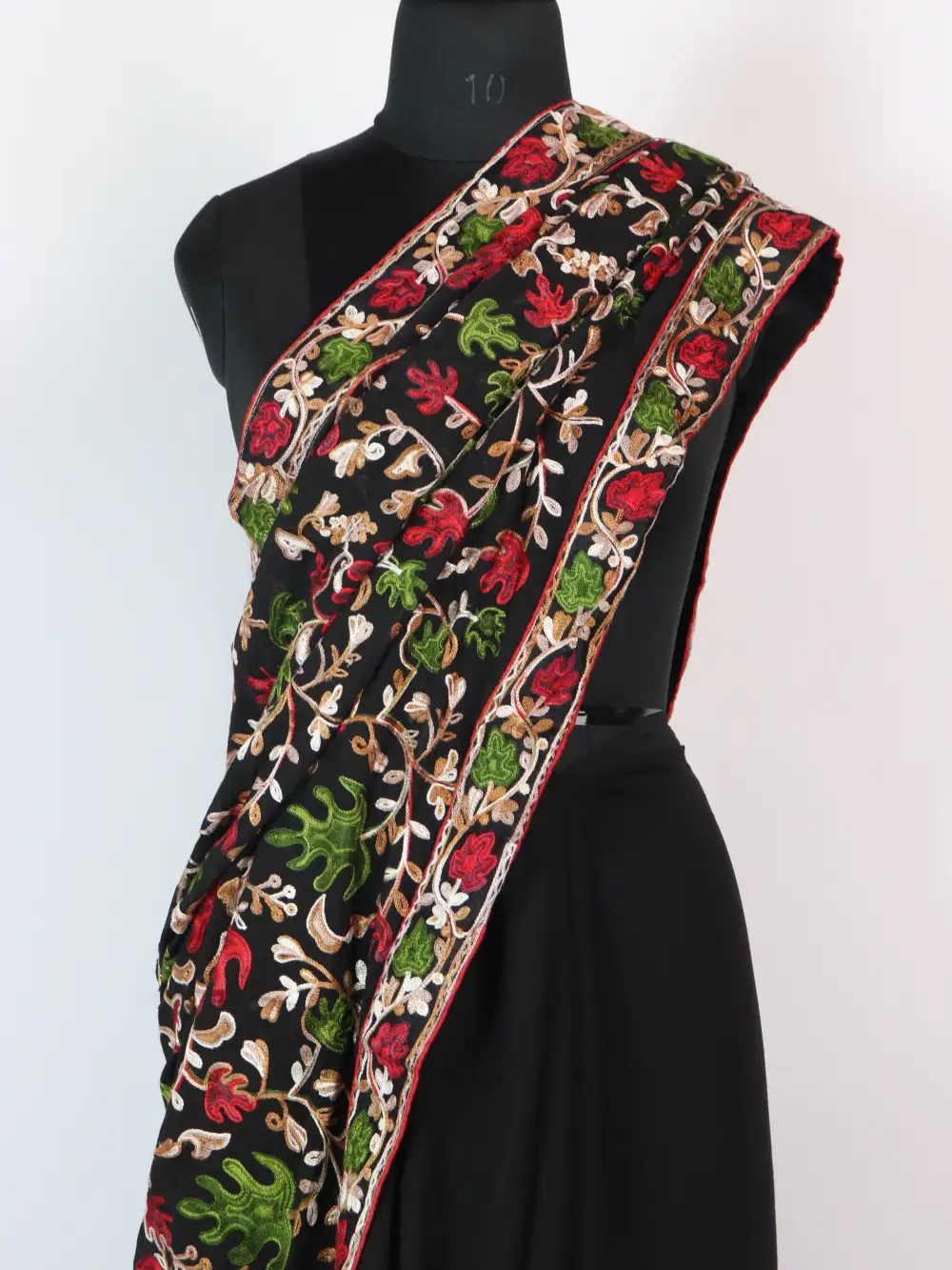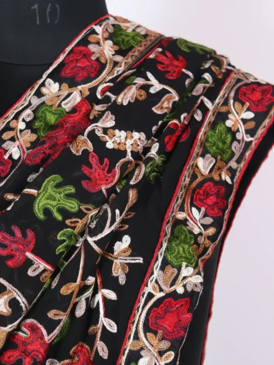 With flowing georgette as its base, this black color saree carries charm through elegant Aari embroidery of red, green and brown chinar motifs. The pallu and border showcase this chinar design, adding richness to its airy fall. This piece is ideal for women who want elegance without heaviness—stylish enough for festive events, yet comfortable for everyday gatherings. It is a graceful balance of tradition and lightness.