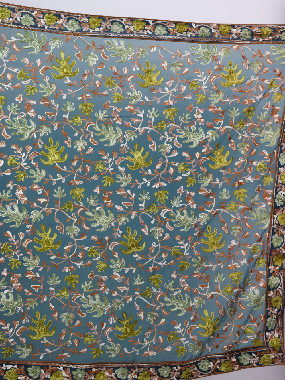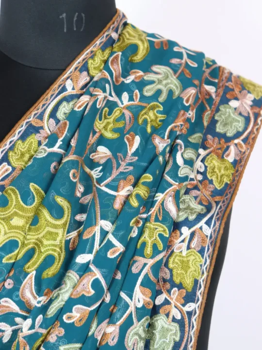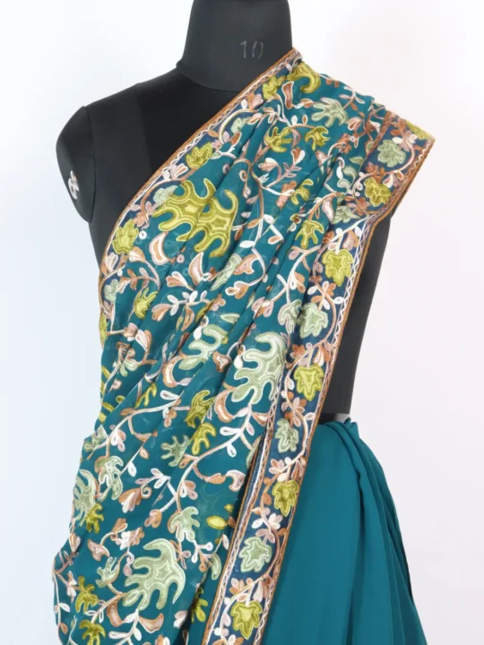 Made in airy georgette, this teal blue saree celebrates the timeless motif of the chinar leaf. With Aari embroidery in green and brown flowing across the pallu and edging the borders, it has an expressive look. It is light on the body and easy to style, it makes a wonderful companion for gatherings, parties, or moments when you want tradition wrapped with modern ease.