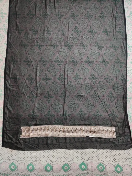 Soft black georgette gives this embroidery saree a very graceful fall. Its zari work adds a gentle shine which makes it perfect for elegant gatherings. Those continuous badam motifs run inside two neat parallel lines, and bigger badam designs are placed at the corners. The body has been kept plain, which makes the border stand out beautifully.