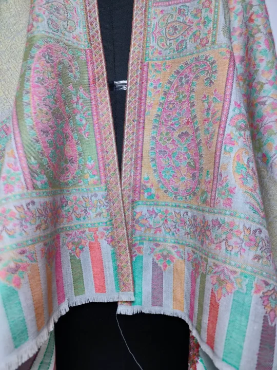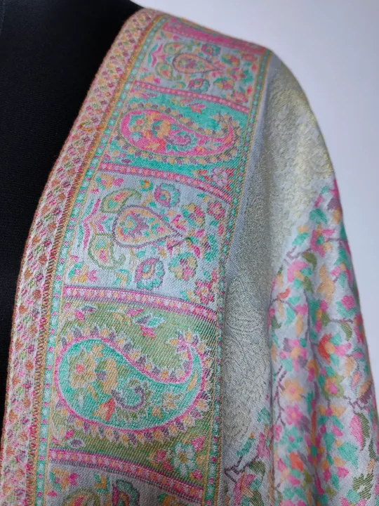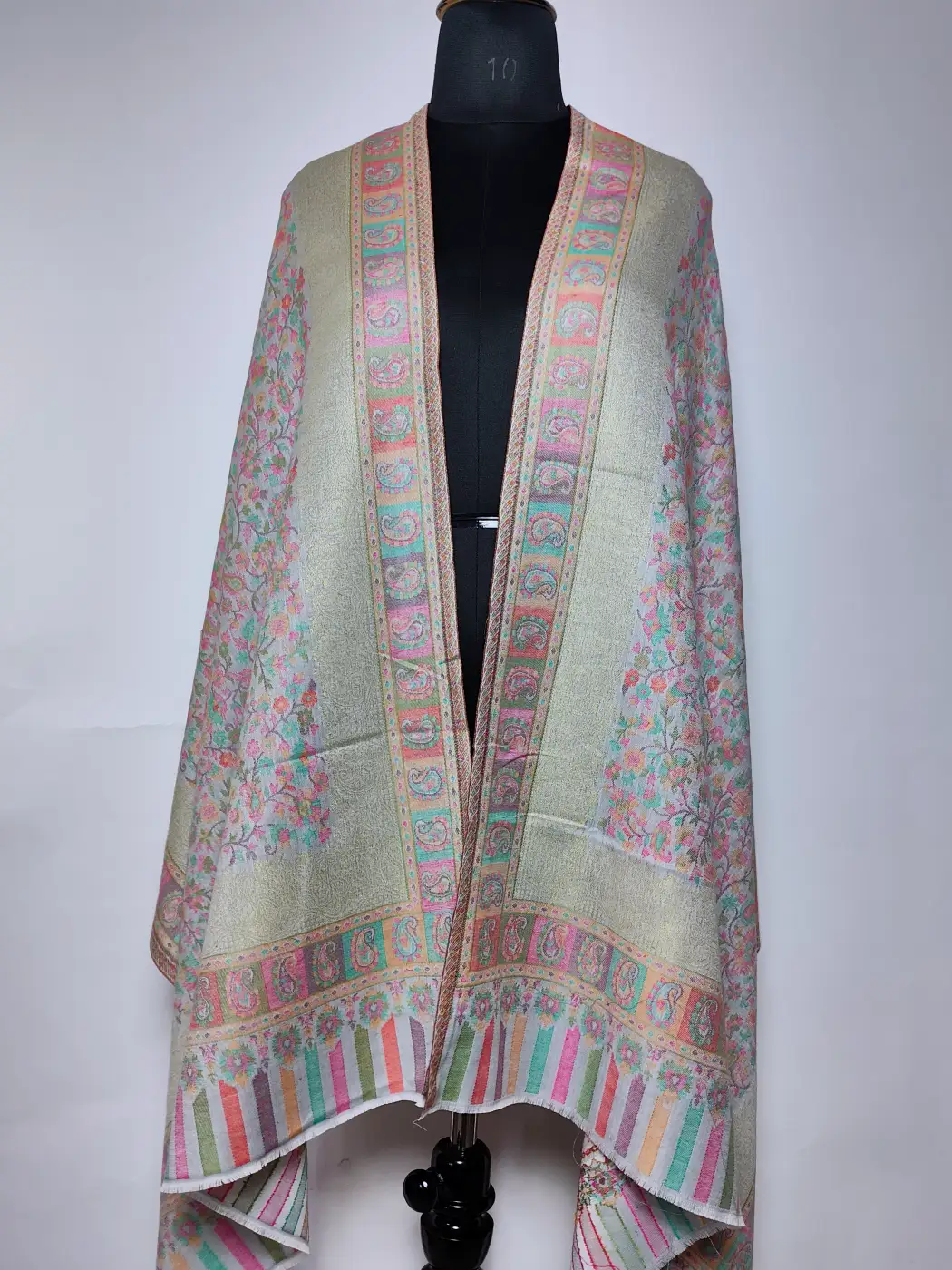 Floral patterns flow gracefully across this beige kani stole, while striped and badam borders frame the design neatly. Crafted in soft modal silk, the kani weave brings depth and richness. It carries a quiet elegance that feels traditional and easy to pair with modern outfits.