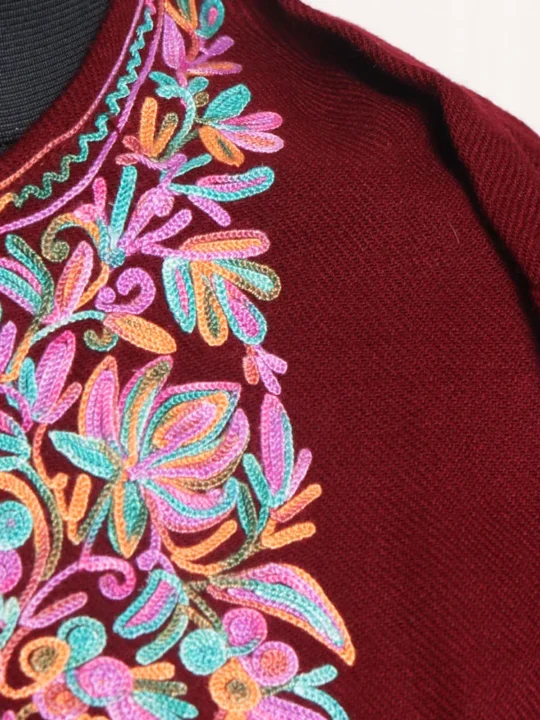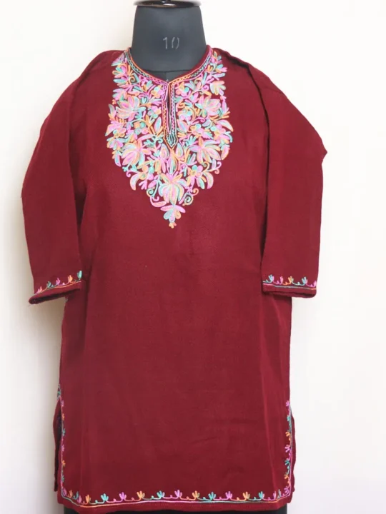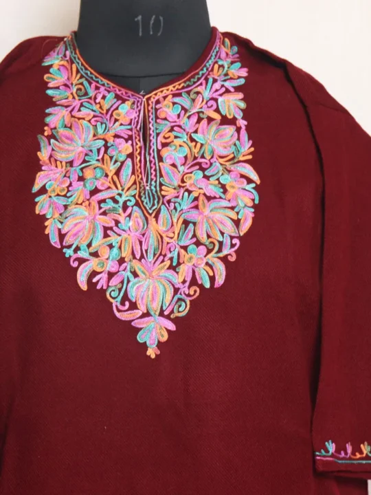 This girls maroon Pheran in Cashmilon is an ideal outfit for the winter season. Its soft fabric keeps your child snug, while the elegant Aari embroidery adds a stylish touch. Whether for festive gatherings, family outings, or school events, this pheran is a reliable and charming choice.