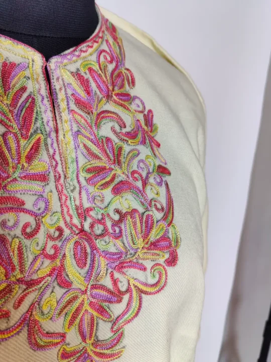 Kashmiri traditional pheran dress made for 7-8 year old girls, comes in cashmilon wool and it features floral aari embroidery at the neckline. It blends Kashmiri comfort with practicality, and both-side pockets make it a sweet pick for everyday winter style.