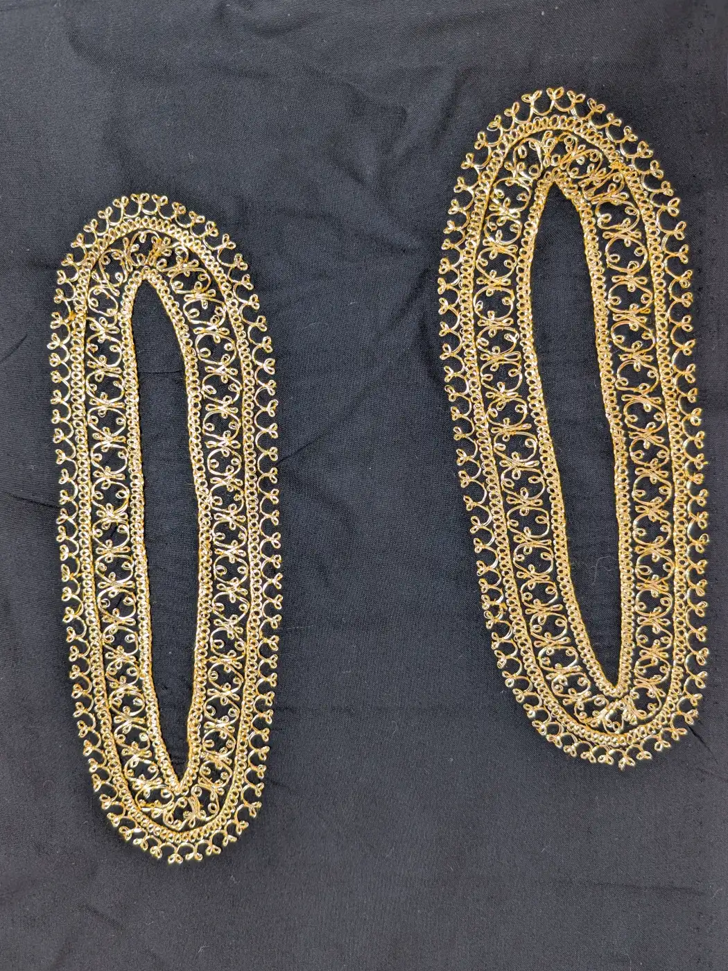 If you want something original yet tasteful, this hand tilla patch is ideal for you. The black neckline is shaped with detailed badam motifs in silver tilla. Its lace and pocket patch continue the same rhythm with repeating motifs. This handwork patch feels neat, premium, and beautifully traditional.