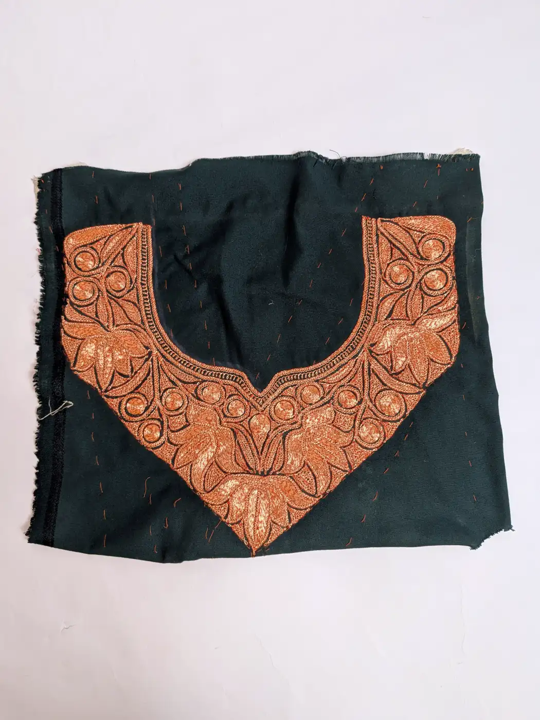 This dark green hand tilla patch brings elegance in a simple way. This neck patch carries badam motifs flowing across the neckline. It has been handcrafted in golden hand tilla, which reflects light softly, giving a rich and graceful finish. The overall look is a masterclass in understated luxury, which makes it perfect for those who appreciate subtle sophistication.