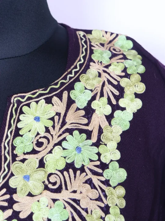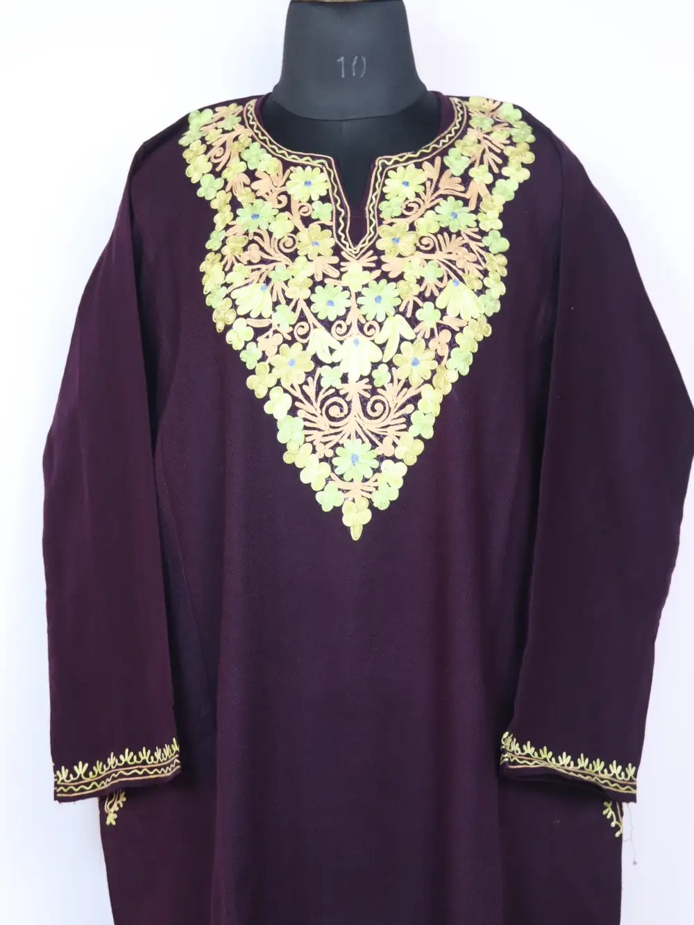 Embroidered at neckline in floral patterns this purple pheran comes in chest size 53 inches and length 44 inches that provide relaxed proportions for easy layering. It has been crafted in cashmilon wool for providing warmth against winter cold days.
