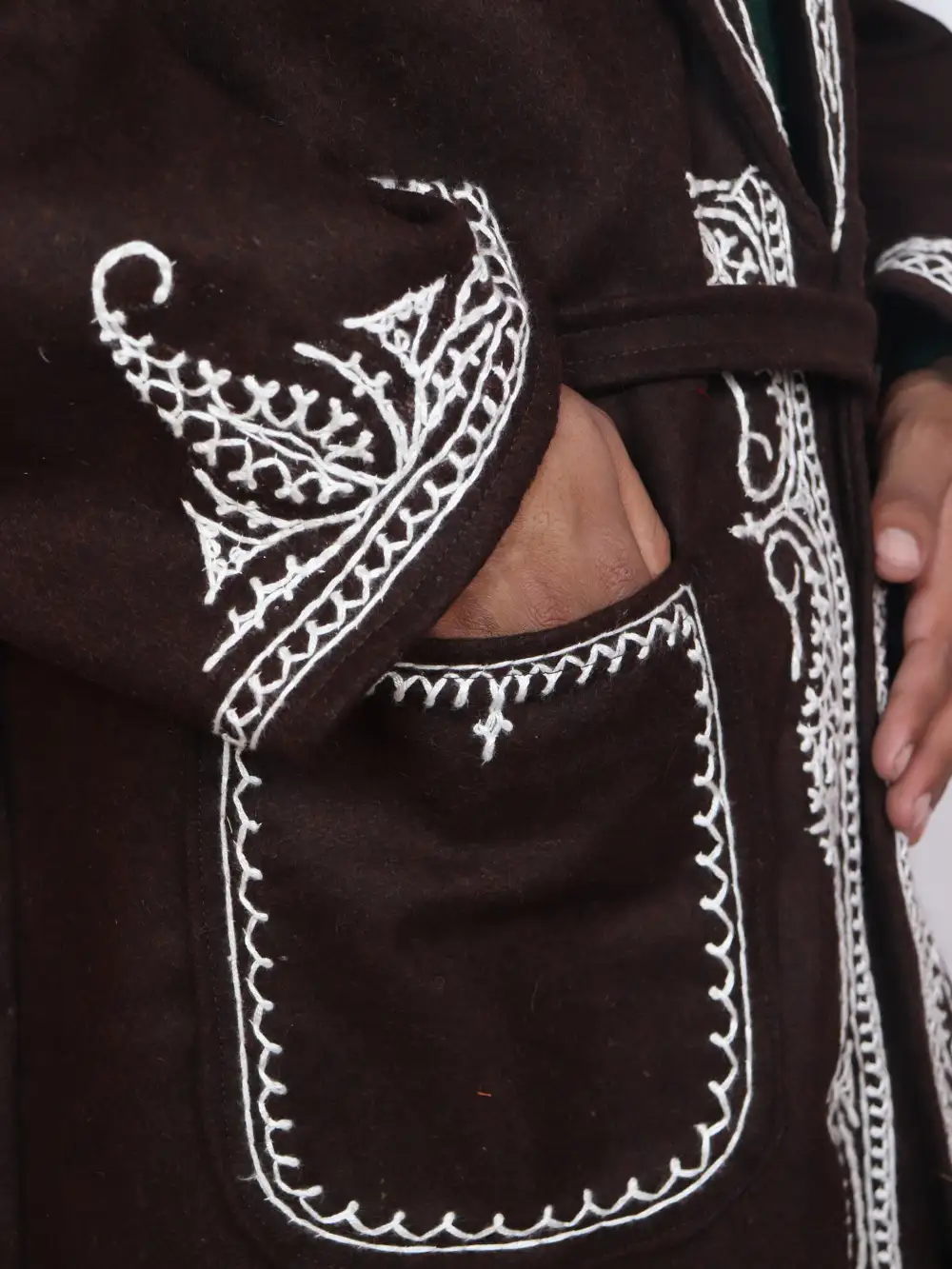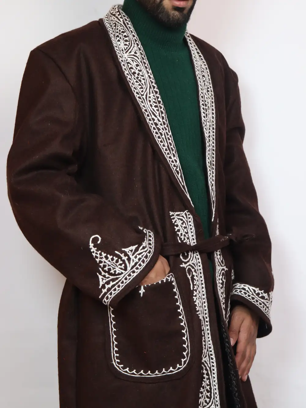 Handcrafted with Aari flowers along front side collar, pockets and sleeves, this dark brown gown in tweed wool comes with chest size 49 inches and length 49 inches a well for generous layering. It also includes belt which provides customized fitting.