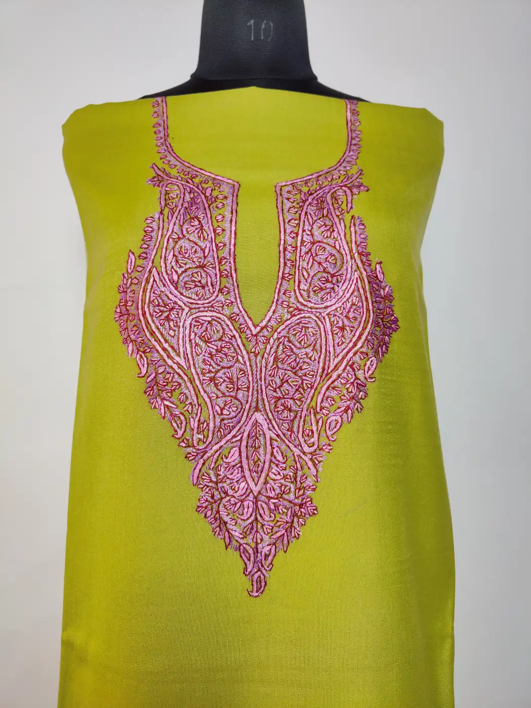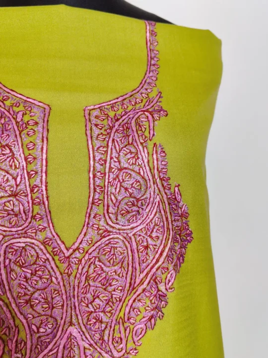 This 2pc suit showcases intricate hand sozni work which is shaped into elegant badam motifs, giving this Kashmiri embroidery suit a traditional character while keeping the outfit breathable and comfortable for warm days. This suit is crafted in soft summer cool fabric and it includes an unstitched kurti with trouser to tailor as you prefer.