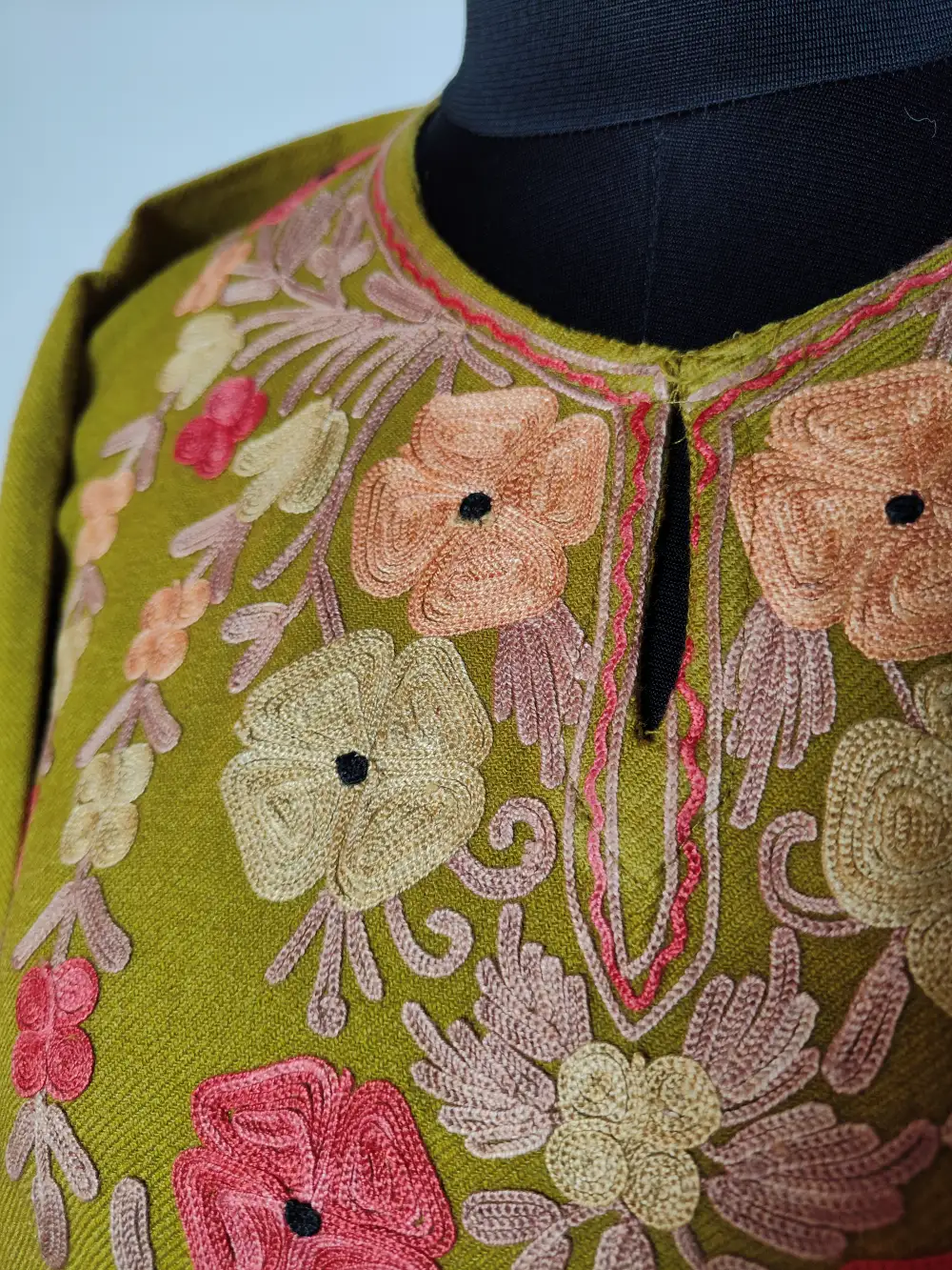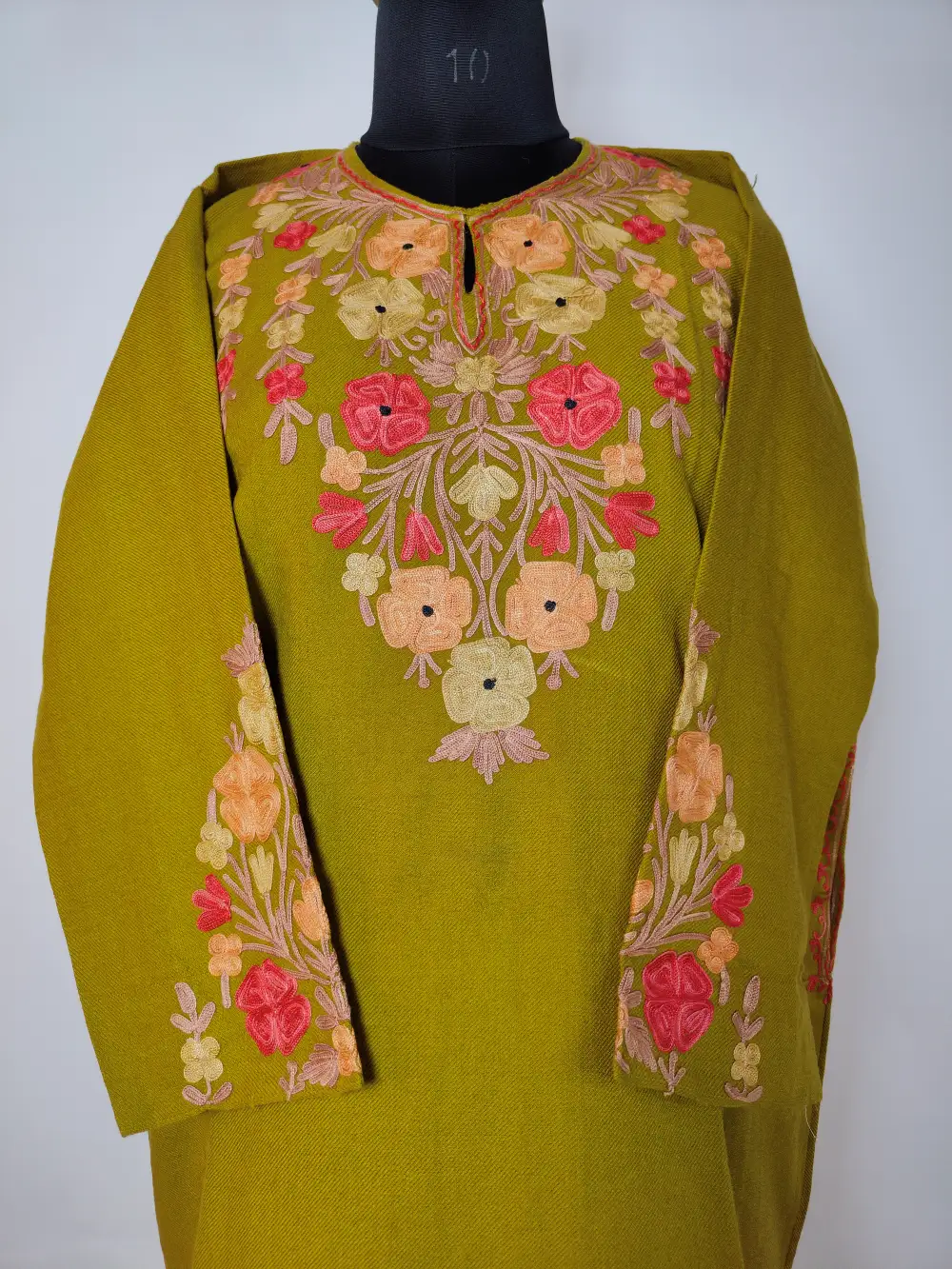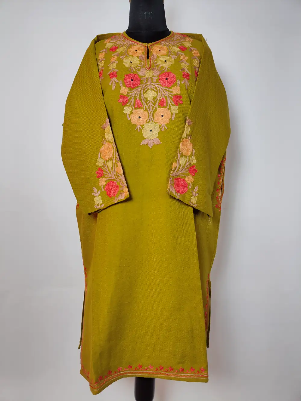 Crafted in soft cashmilon wool, this green color pheran carries the gentle artistry of Aari embroidery. Red, light orange and brown floral motifs brighten the neckline, makes it an elegant yet easy-to-carry garment. Its warm, comfortable drape ensures you stay cozy while still feeling stylish. It is ideal for daily wear or social gatherings, this pheran balances comfort with graceful detailing, offering timeless charm for the colder season.