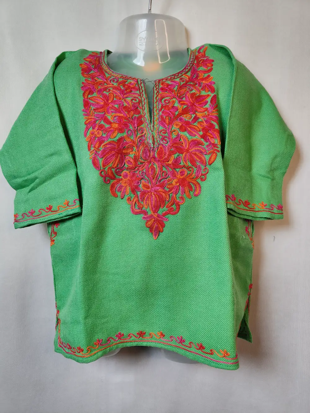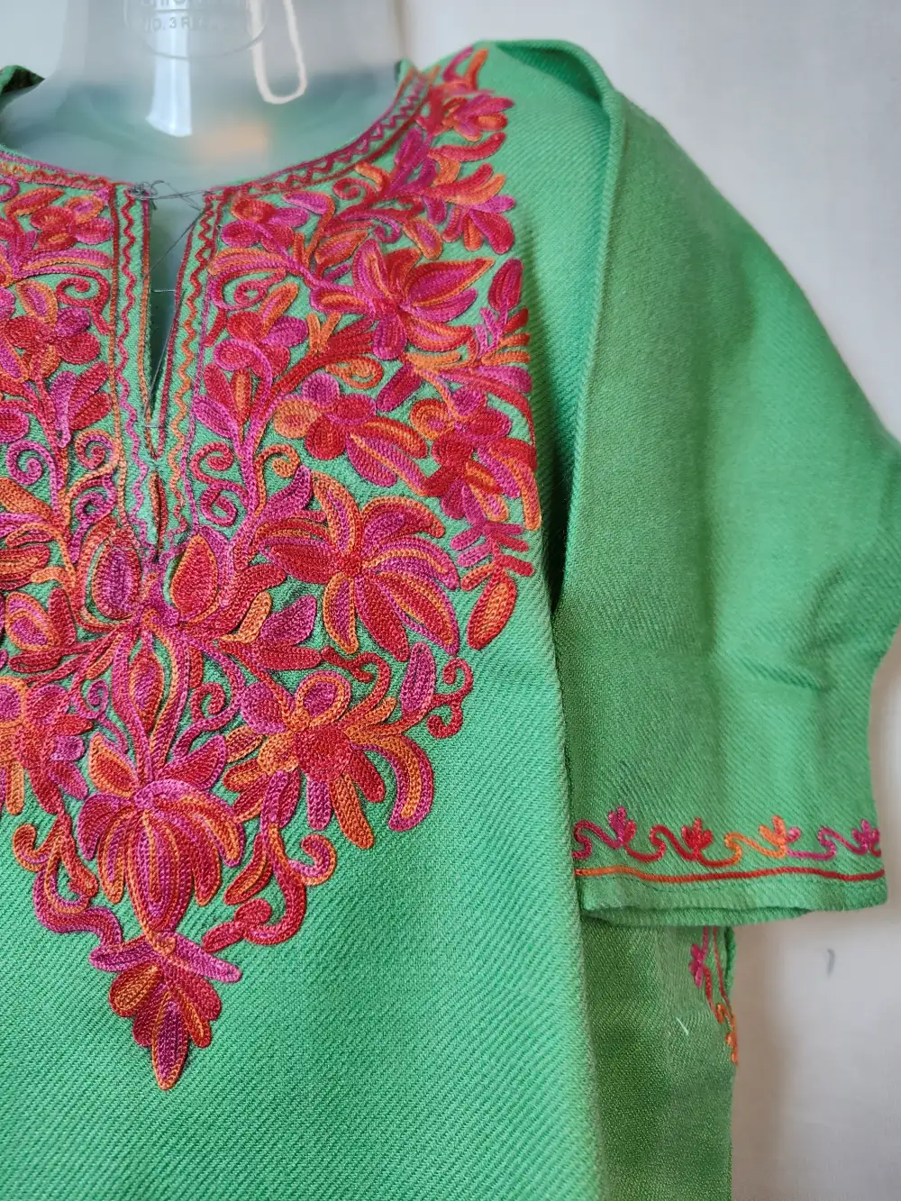 Stitched from cashmilon wool to suit kids winter days, this kashmiri faran comes in green colour. It displays aari embroidery with floral detailing at neckline.