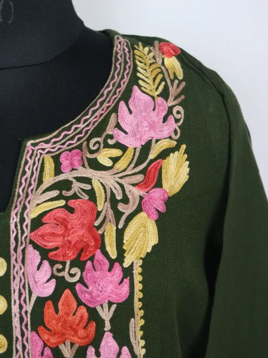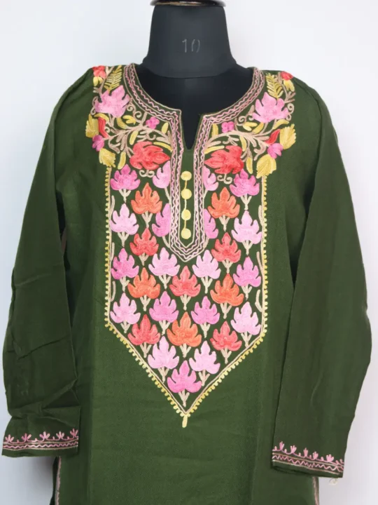 Classy kurtis in green colour is shaped in cashmilon wool bloom with aari embroidery around the neckline in geometrical patterns. It features chest size 41 inches and length 41 too which refine it.