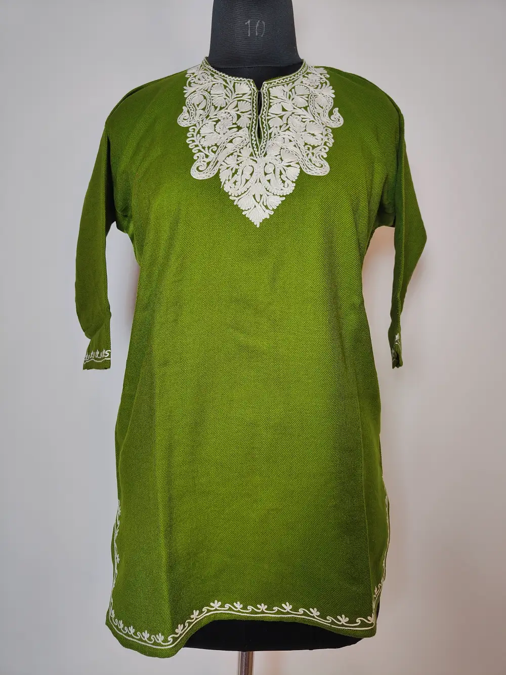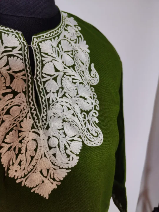 This green colour Kashmiri feran, made for 7-8 year old girls, offers cashmilon warmth and neckline aari embroidery in floral patterns. It is perfect for little girls who love soft, traditional winterwear.