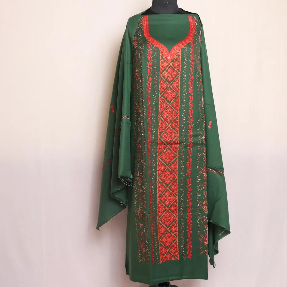 This kashmiri unstitched polywoolen suit is a perfect blend of heritage and beauty. With its hand Aari and sozni embroidery it adds a distinct Kashmiri flair to your look