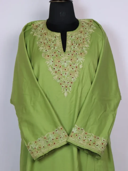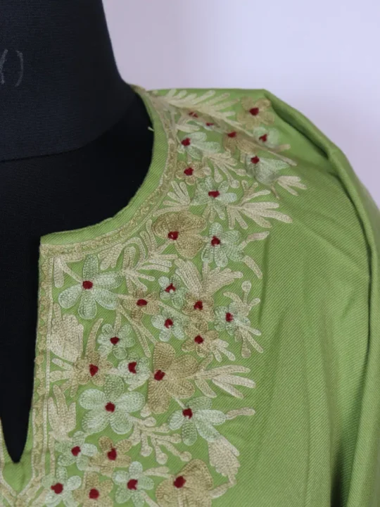 Made from soft pattu tweed, this green Kashmiri Pheran features elegant green Aari kadhai around its neckline in floral motifs. It is designed with two side pockets, it fits comfortably with its 54-inch chest and 45-inch length. This feran keeps you warm yet graceful, which reflects the same artistry seen in phiran kashmir pieces.
