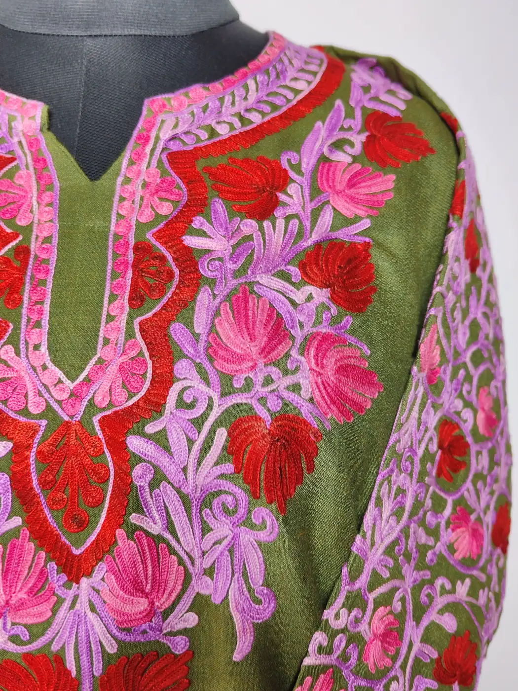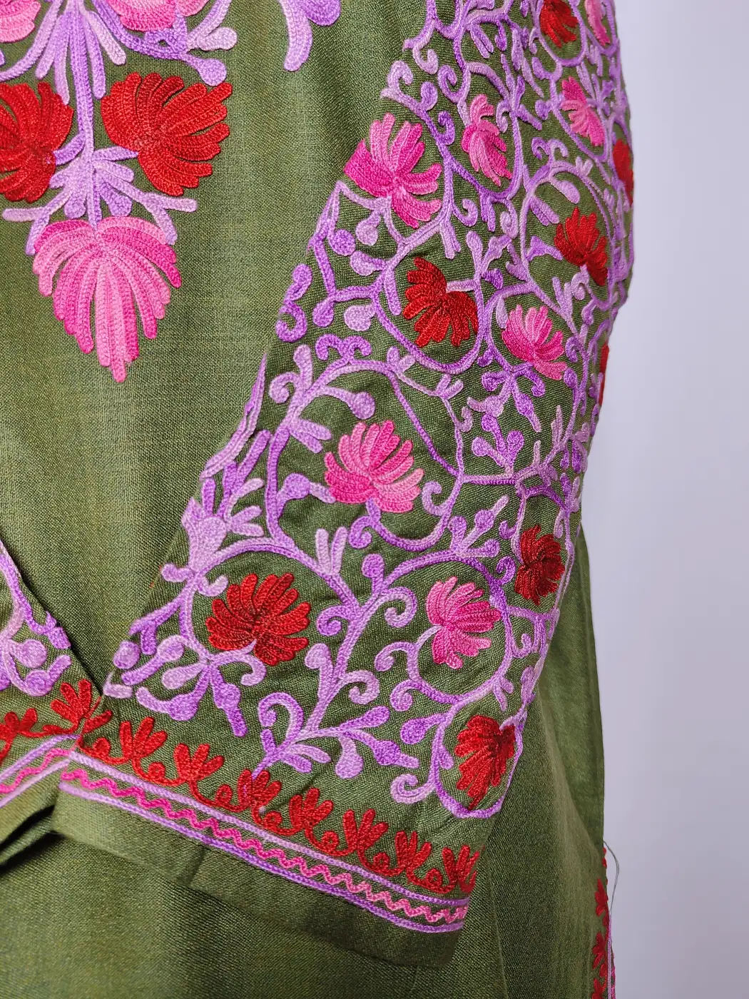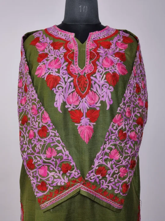 Floral embroidery at the neckline enhances this Kashmiri work kurti set, while sleeves carry detailed jaal patterns. Made from gree ruby cotton, it includes kurti and trouser, offers a simple yet elegant Kashmiri style.
