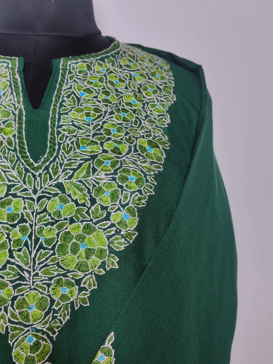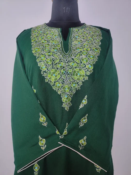 Floral hand sozni embroidery draws attention to the neckline of this Kashmiri kurti coord set, while booti patterns decorate the sleeves and front panel. Crafted in green summer cool cotton, it includes kurti and trouser for complete set.