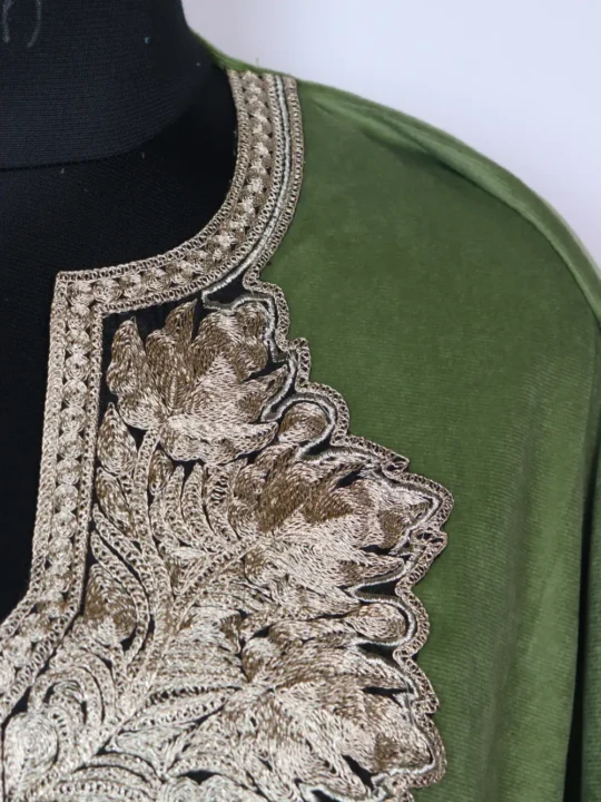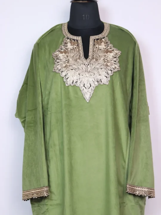 This green pheran in Velvet shows Zari Tilla embroidery in chinar floral at the neckline and it comes with practical pockets both side for easy use.