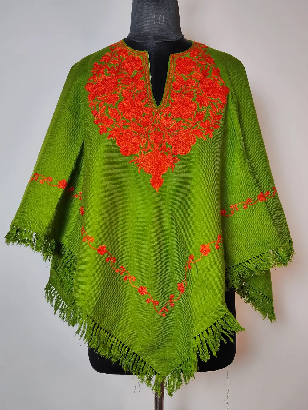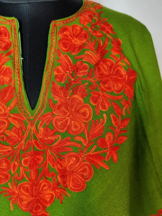 Created from green cashmilon wool supported by lining, this ponchu is adorned with aari embroidery in floral patterns around neckline and border.