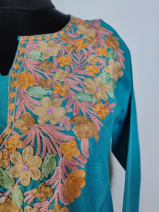 Made in oceanic geen hue ruby cotton, this long kurti shows Kashmiri aari embroidery blooming in floral and badam motifs at neckline.