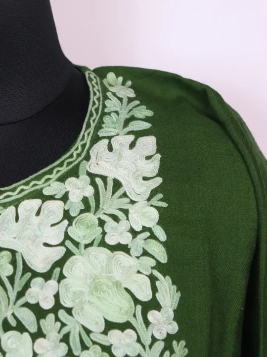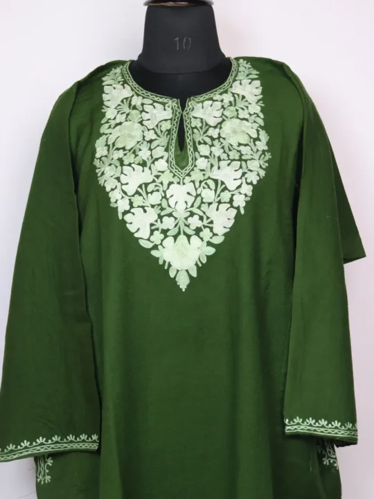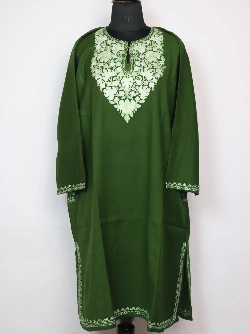 A calm green kashmiri pheran cut from Raffal Wool shows floral and chinar pattern Aari kadhai at the neckline. It comes with chest size 54 and length 43 that provides a relaxed fit.