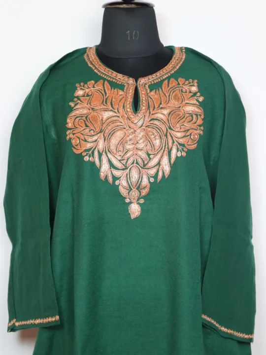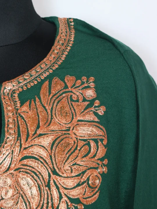 This stylish Kashmiri feran has been crafted from green raffal wool features botte tilla embroidery at the neckline. It holds Kashmiri essence and offers chest size 52 and length 50 for graceful winter dressing.