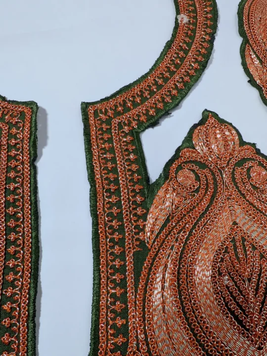 A blend of paisley motifs defines the sleeve patches and neckline of this green patch, while continuous chinar embroidery flows across the lace. Crafted in golden tilla work, the patch carries a graceful and classic Kashmiri design language.