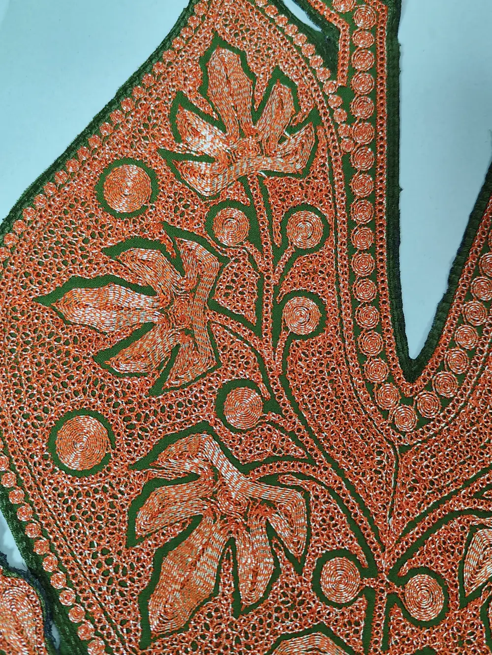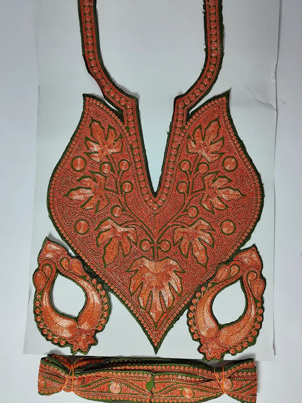 Created using intricate tilla embroidery in chinar motifs on green fabric, this patch reflects Kashmiri aesthetics. This patch fit well on pheran necklines, kurti sleeves, or shirt fronts.